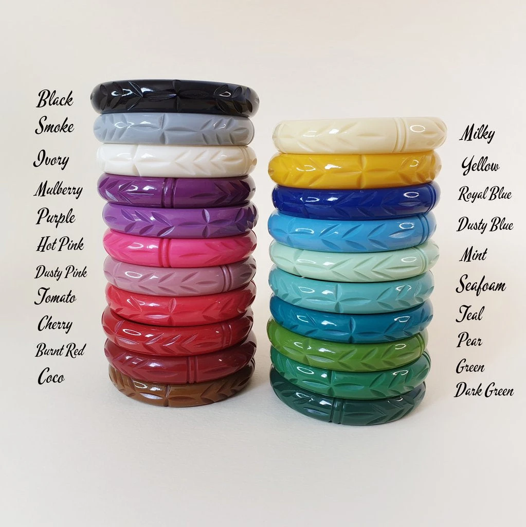 Based on vintage designs for that authentic look, the fabulous carved fakelite Elsie bangle in Green!