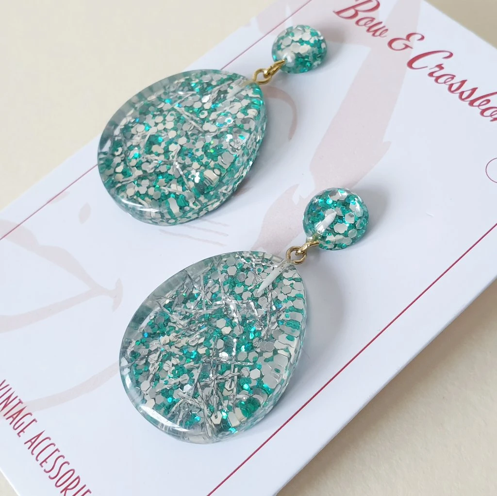 Accessories Bow & Crossbones Suzy Tear Drop Lucite Confetti Stud Earrings – Teal