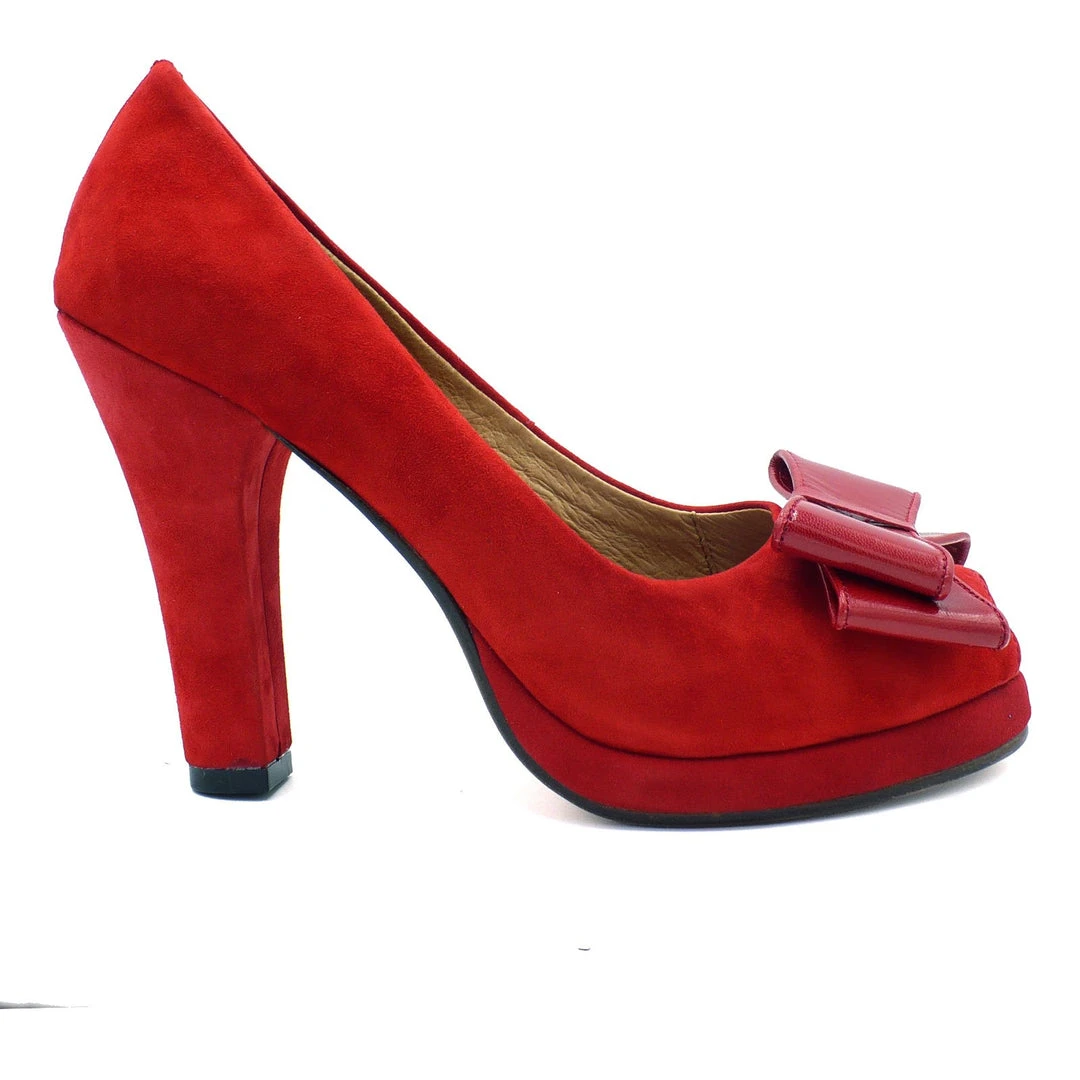 1940’s high heel platform pump with peep toe and bow accent.
