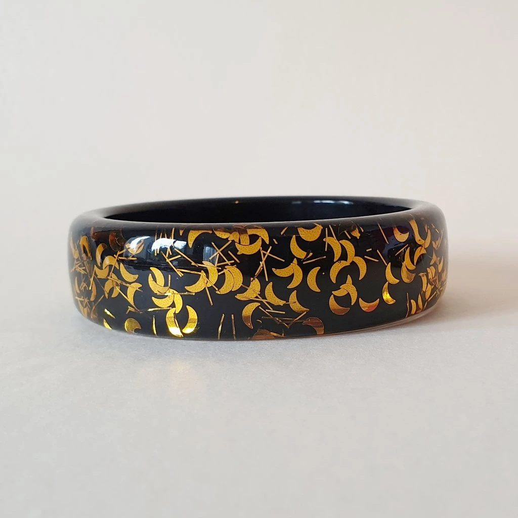 The stunning glam reproduction Billie lucite confetti bracelet in shade Black Russian. Ready to FEEL expensive & waltz down the stairs, cocktail in hand? Inspired by classic vintage Clamper bracelets – this pretty is as close to original confetti inclusions as possible.