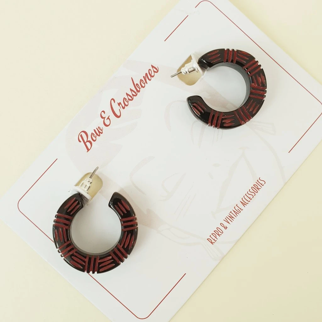 These fabulous reproduction cast resin hoop earrings have an external measurement of approx 2.6cm diam.Â