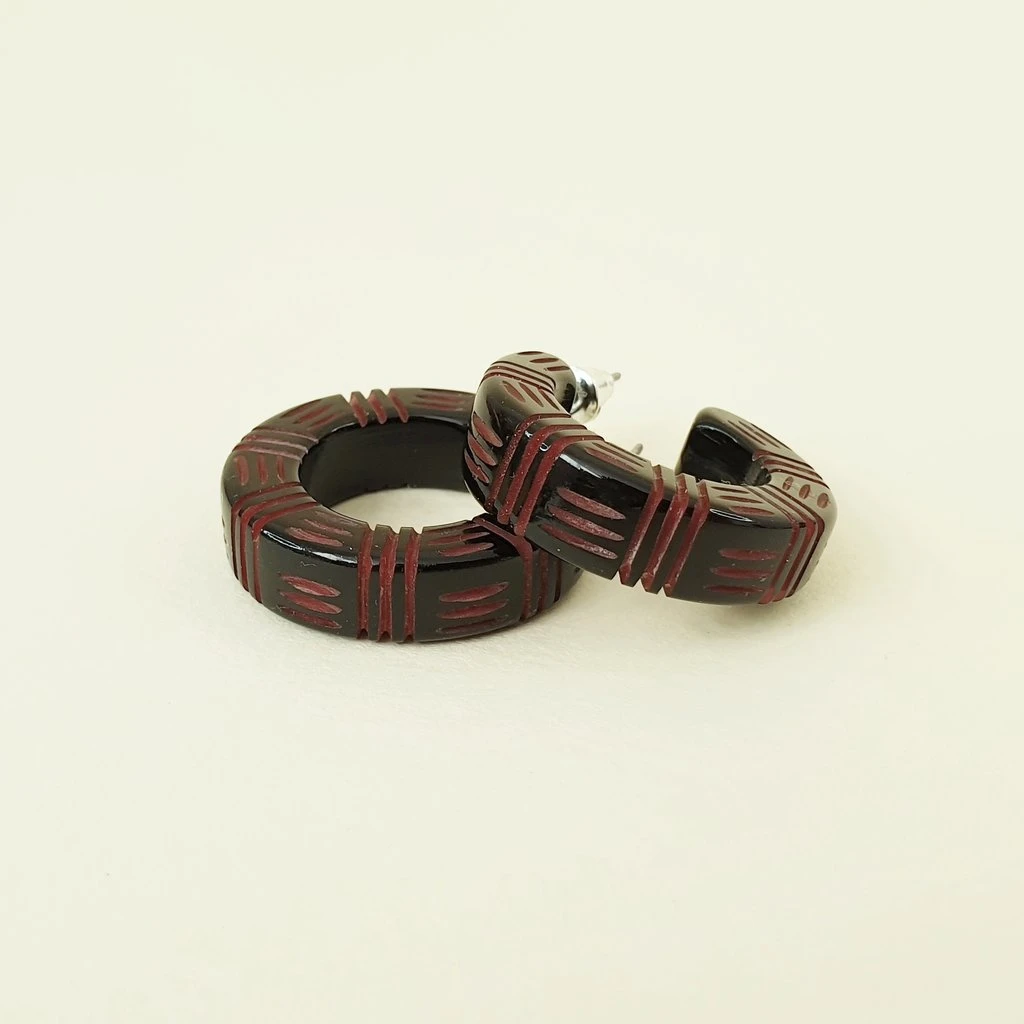 The Kane Wicker carved fakelite earrings now available in host of 2 Tone colourways, like this stunning Lava shade! A gorgeous colour combination, inspired by true vintage bakelite.Â