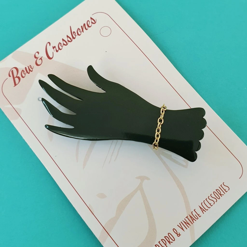 The Lilianna Hand Brooch is a classic fakelite reproduction of an authentic vintage style.