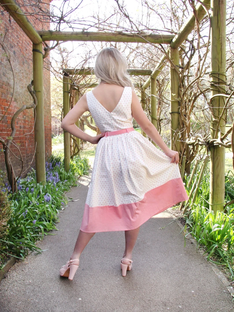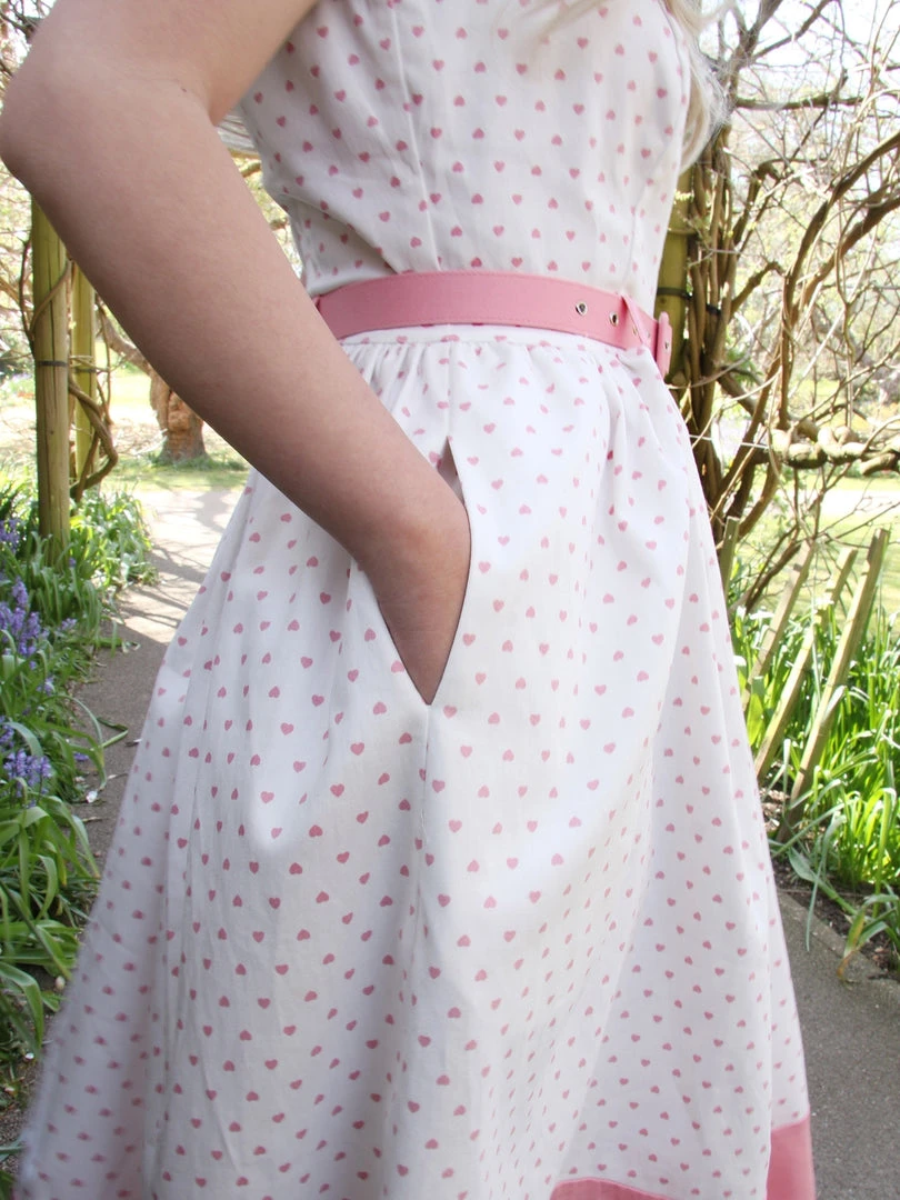 This pretty piece is our Brielle Love Heart Swing Dress – a cute, mid-century inspired style that just needs to be part of your collection! She’s fitted on the body with a boat neck that dips into a V at the back. Her skirt is gathered at the waist, and falls to approximately below the knee with a pink panel at the hem. She even has handy side seam pockets! She comes in white, and is covered in our bespoke print of adorable pink love hearts! She includes a pink belt to cinch in the waist, and she fastens via a covered zipper at the middle of her back.Â
