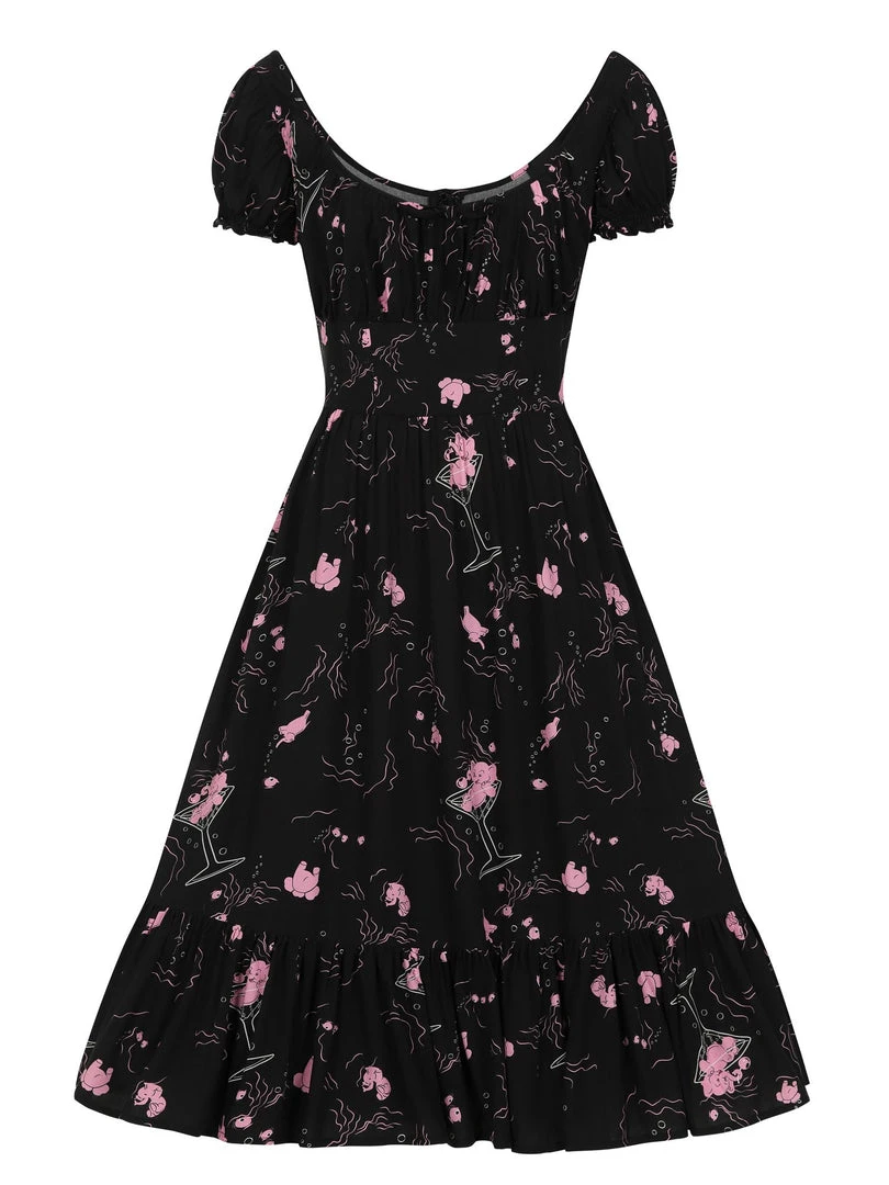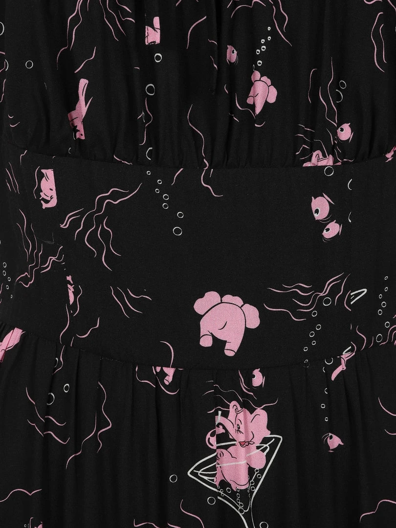 They say elephants never forget, but seeing as these have had a little too much fun, we don’t think they’re going to be remembering much! The Carmen Tipsy Elephants Dress is a lightweight and relaxed dress, made from flowy viscose fabric in a deep black. She features a bespoke print of pink elephants having the time of their lives, floating around and sitting in cocktail glasses. Her fitted bodice has adorable, short puffed sleeves with frilly hems, a little tie-detail in the centre of her scooped neckline. Her bust is gathered at her wide waist panel in a milkmaid style. Her loose fitting gathered skirt flows down to approximately below the knee, with a large ruffle at the hem. She fastens with a zipper running down the centre back.