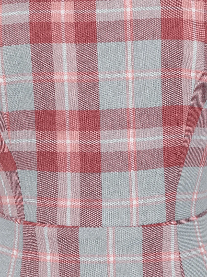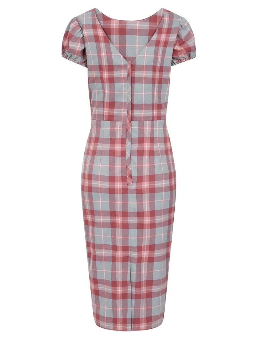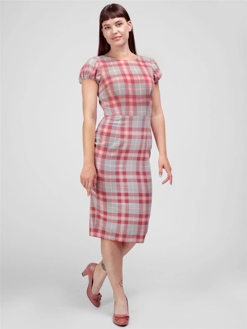 This fun, whimsical style is the Dermira Princess Check Pencil Dress! It comes in bespoke Princess Check, a woven check of soft candy pink with white highlights set against a baby blue/grey background – giving us serious ice princess vibes! It’s fitted on the body with a round neck at the front that dips into a V at the back, and elasticated puff sleeves, The pencil skirt fits close to the leg, ending approximately just below the knee with a vent at the hem for ease of movement.Â