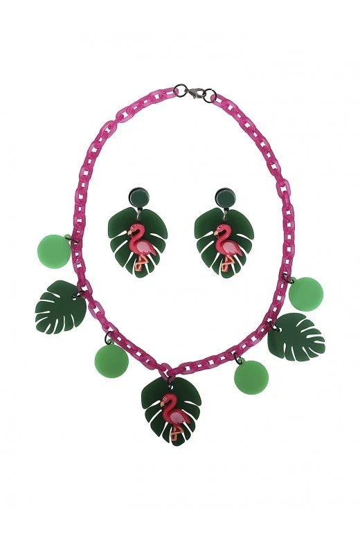 Tropic it like it’s hot with our Flamingo Tropics Set. She’s comprised of a matching necklace and earrings with acrylic palm leaves and pink plastic flamingos. The earrings feature these dangling from green round studs, and features a bright pink chain with green discs and palm leaves alternating with a flamingo in the centre. Try pairing yours with our Carmen Tiny Polka Swing Dress!