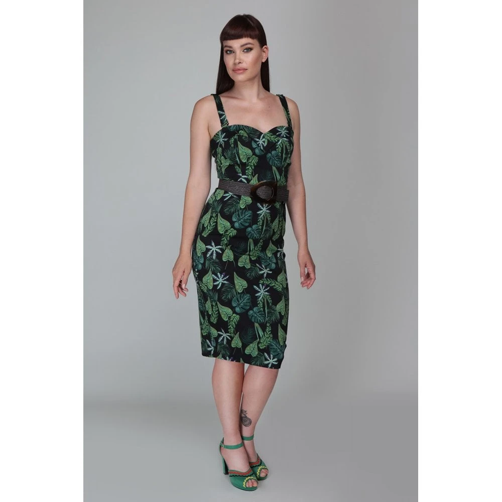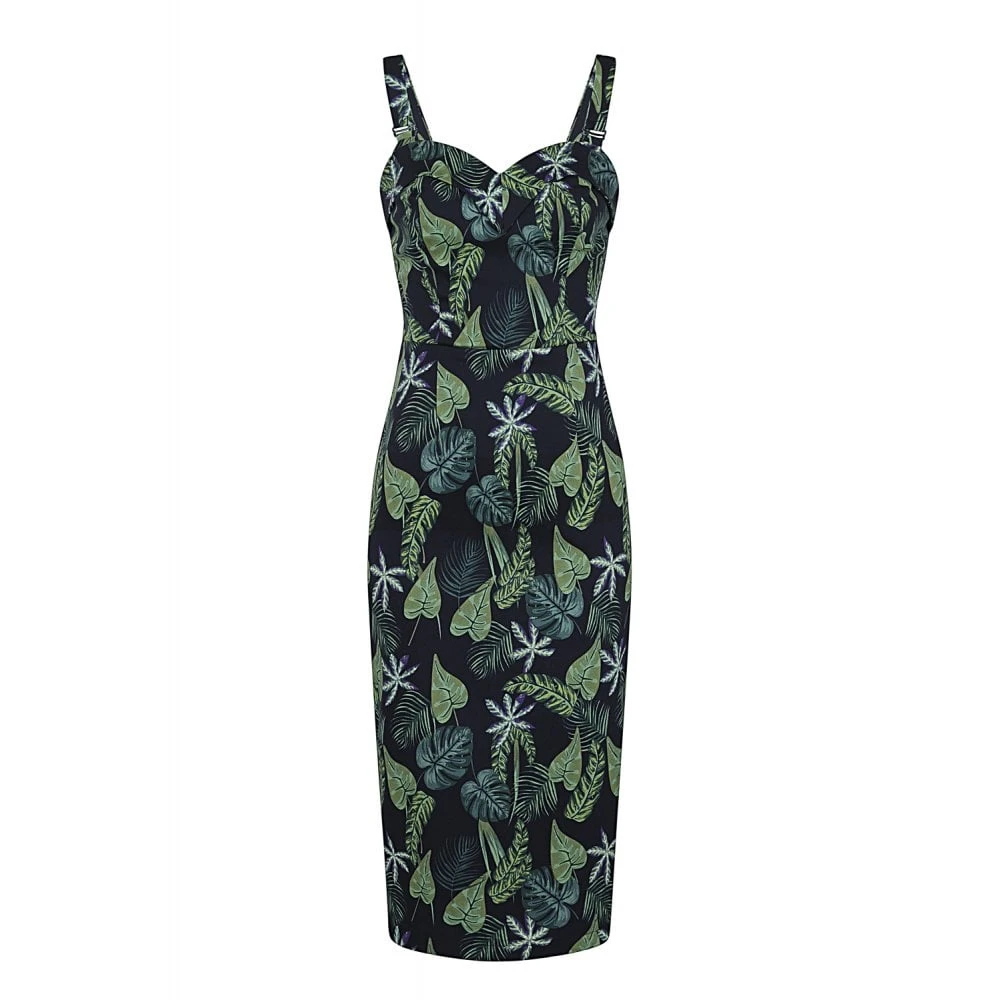 The Kiana Black Forest Pencil Dress is one of our best kept secrets, because she features adjustable and removable straps, so you can wear her in a number of ways to change up your look! She’s a fitted style with a foldover sweetheart neckline. Her bespoke print features an array of luscious green leaves on a black cotton sateen background. This style fastens via a covered back zip, and ends approximately just below the knee with a hem vent at the back for movement.Â
