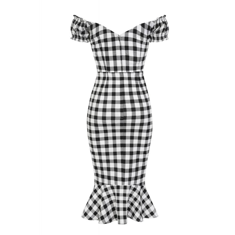 Channel sassy siren vibes with our Sasha Vintage Gingham Fishtail Dress. She’s a gorgeous summery piece, with a super flattering sweetheart neckline created by pulling the cord at the front of the bust – which ties into a neat bow. Because of this, you can decide how daring you wish the plunge neckline to be. She has elasticated off the shoulder Bardot sleeves, and a shaped V neckline at the back. She fits closely through the body to just above the knee, where she darts out into a striking peplum. Sasha is made from cotton with a slight stretch in classic black and white gingham, and she fastens with a centre back zip. Pair yours with heels and a sparkly necklace for a gorgeous date night or fancy occasion look.