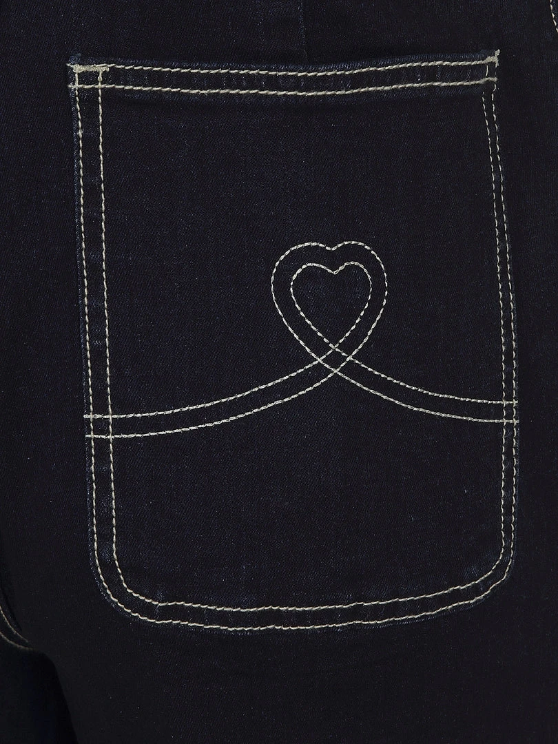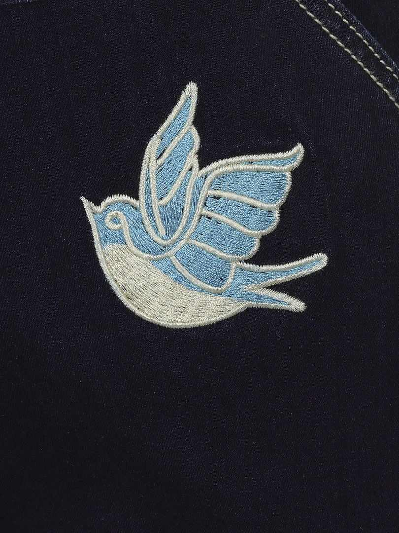 They feature two, adorable swallow embroidery patches on each hip, and the generous back pockets have pretty, swirl embroidery. Their wide waistband has belt loops which are adorned with brass coloured buttons.Â