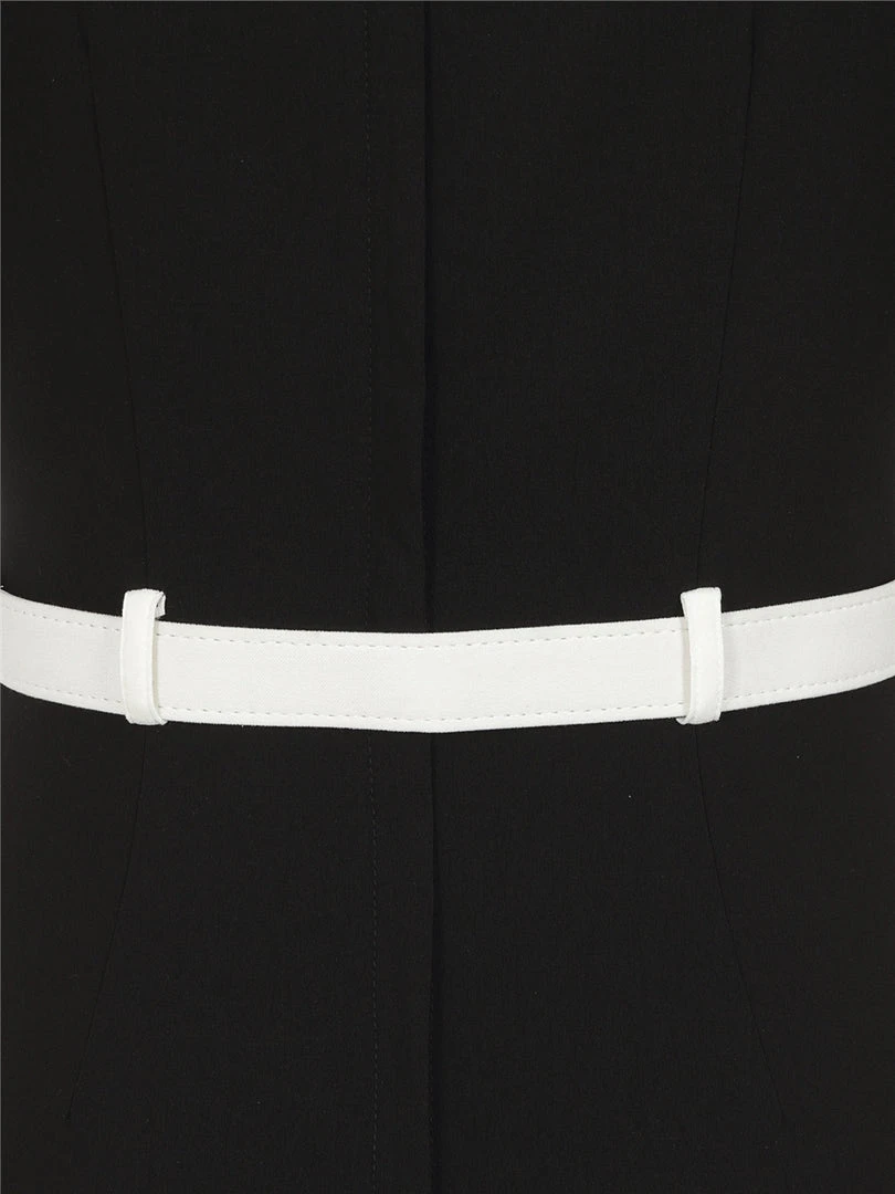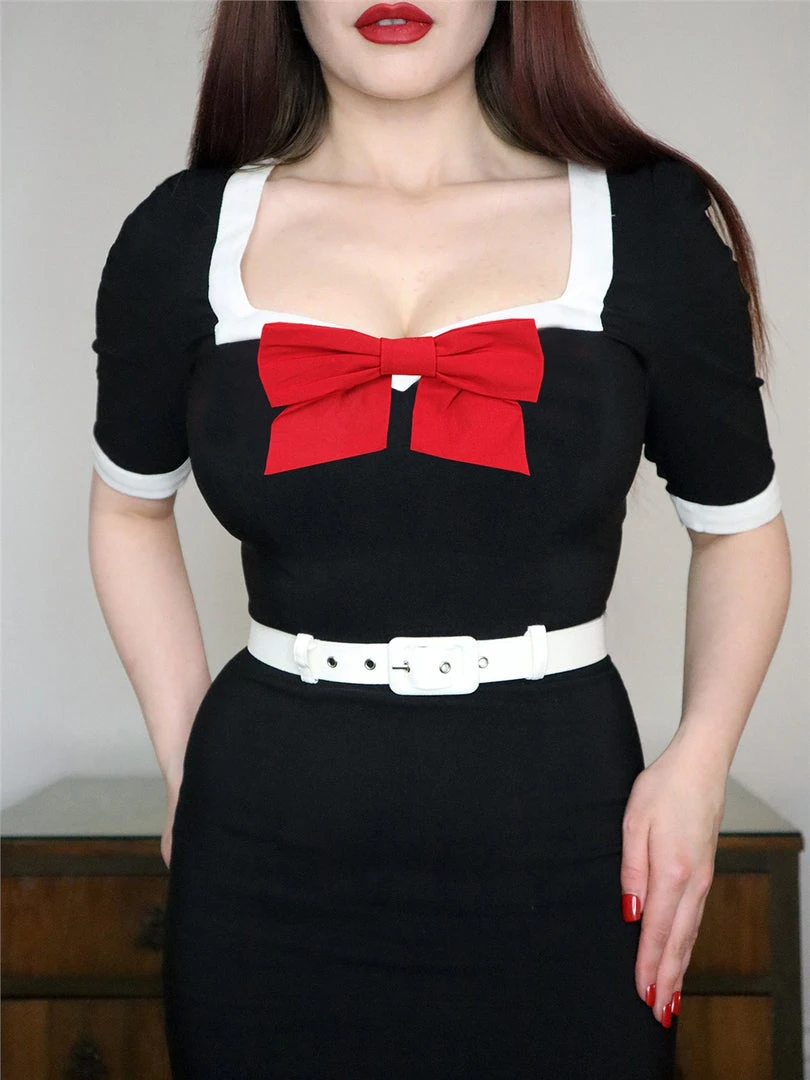 Her large, vibrant red bow sits on her fitted bodice in the middle of her lovely sweetheart neckline and makes a statement against the black fabric of the dress. A contrasting white trim highlights the neckline, and the cuffs of her elbow length sleeves. She includes a white PU backed belt that goes through her white belt loops, giving Sadie even more shape. Her pencil skirt starts at the waist, fitting close against the legs and ending just below the knee, with a hem vent at the back for ease of movement. She fastens at the back with a covered zipper found in the middle of her back, and runs from the top to the hip.Â