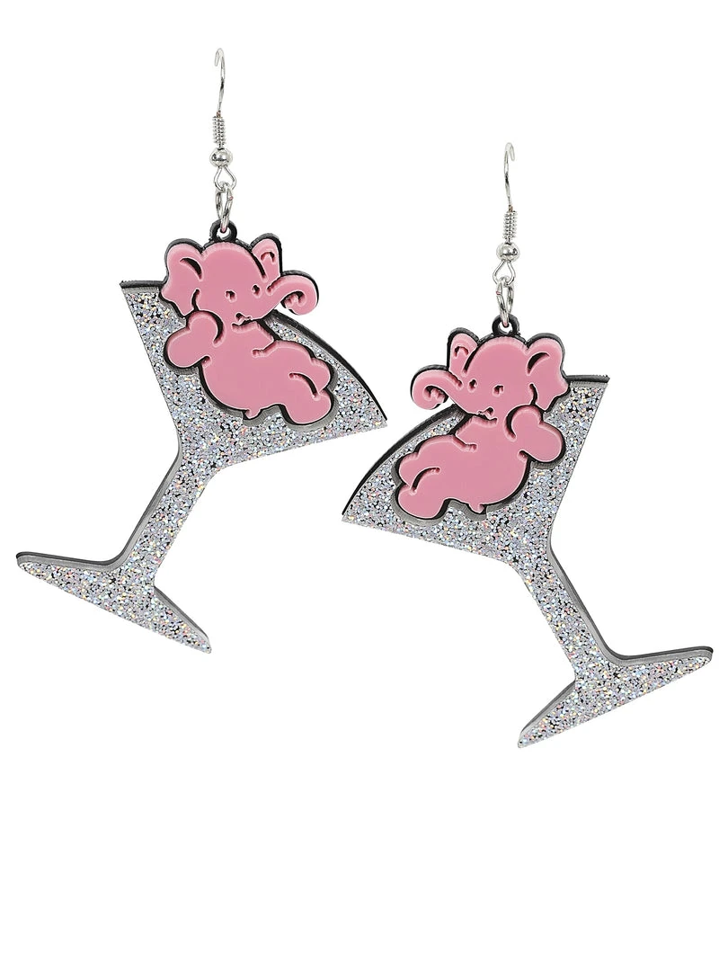 Take these pink elephants on parade! The Tipsy Elephant Earrings are a pair of acrylic glittery martini glasses with bathing pink elephants inside, suspended from french hooks. Don’t forget to pick up the matching brooch and handbag!