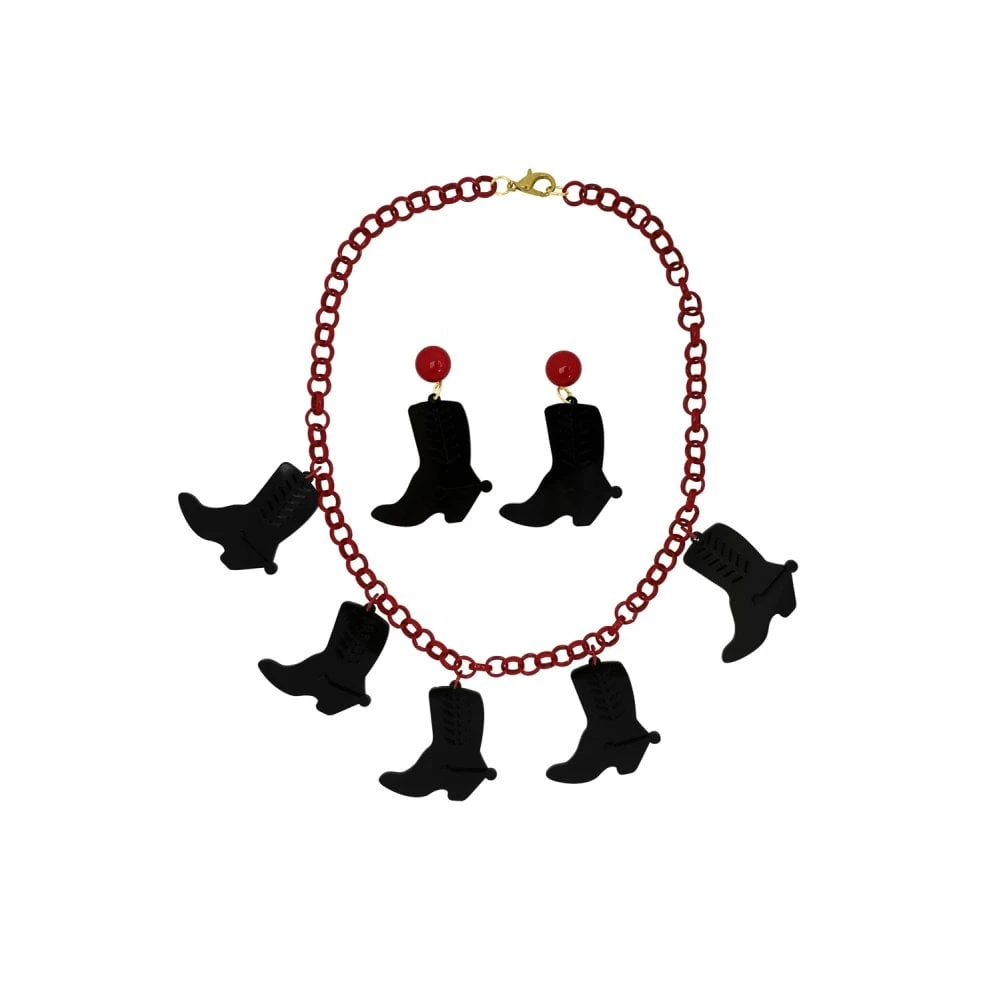 Boogie woogie little country girl. Our Wild Wild West Set is comprised of a necklace with a large red metal chain with five black acrylic cowgirl boots, and matching red domed stud earrings with matching cowgirl boot drops.