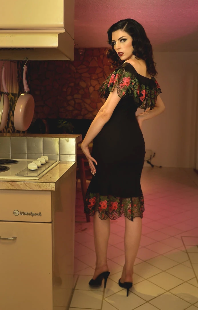This beautiful stretch bengaline swing style off the shoulder Broadway dress is one to go down in the books and has pockets!! The stretch bengaline is a perfect fit to the body. Elastic on the shoulder allows the dress to give a perfect fit worn down or up. And the amazing colour of the roses on the black lace set around the top and bottom of the dress give it the most perfect pop ever.