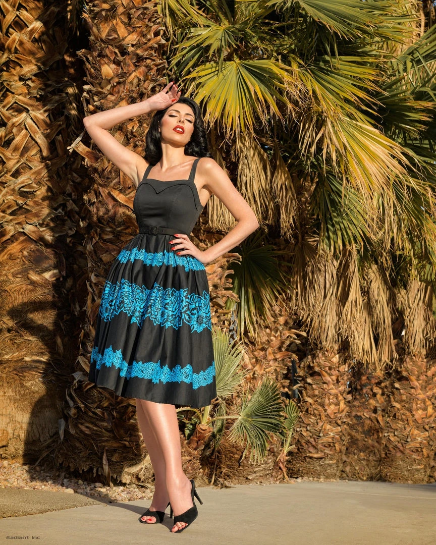 A classic 1950s style swing dress, The Flora will be a go-to spring summer staple with its cinched hourglass silhouette, adjustable straps, sweetheart bust line and full skirt gathered at the hips. Featuring a beautiful custom Blue Floral design on high quality stretch sateen cotton. This fabric is structured with 1-2 inch of stretch.Â