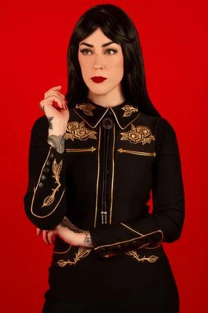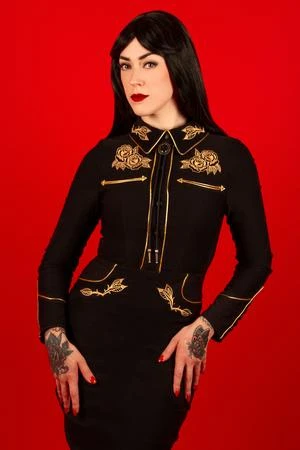 June Carter would swoon over her namesake dress. This stretch bengaline dress features stunning gold accents, long piped sleeves with faux snap cuffs. The front snaps are fixed to create a seamless look. Customized with rose and thorn embroidery on the collar, cuffs, bust, and hips, the pleather piping pulls the whole look together to create a truly striking Western wiggle dress.