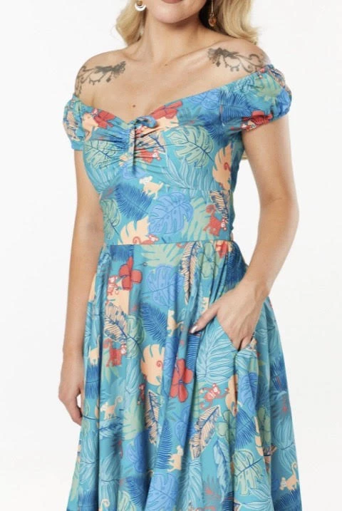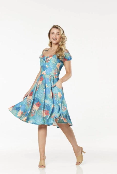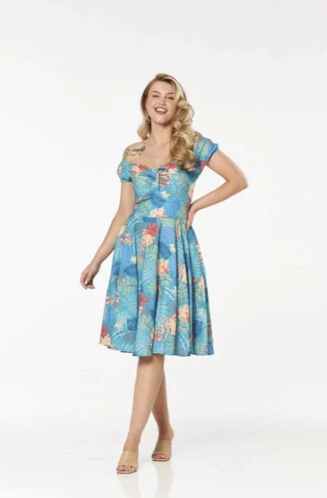 The Maddie Fifties Swing Dress is a must have for every vintage inspired wardrobe! The off shoulder puff sleeves are gently ruched and an adjustable bow is centred. Created for twirling around in, the mid-length flared swing skirt is complimented by the fitted waist which will flatter all figures.Â