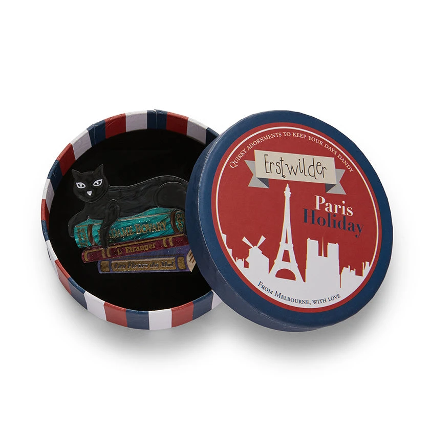 Thoughts of lazy, languid days curled up with a book, or on one – this mixed resin brooch with hand painted detailing is ideal for cat lovers and book lovers alike.