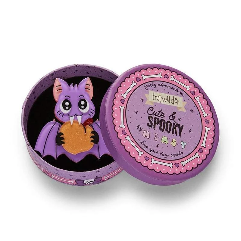 With bright and bold resins this beautiful batty brooch features hand-assembled details that will have you soaring into Halloween like vampire royalty, thanks to Erstwilder X Mimsy.