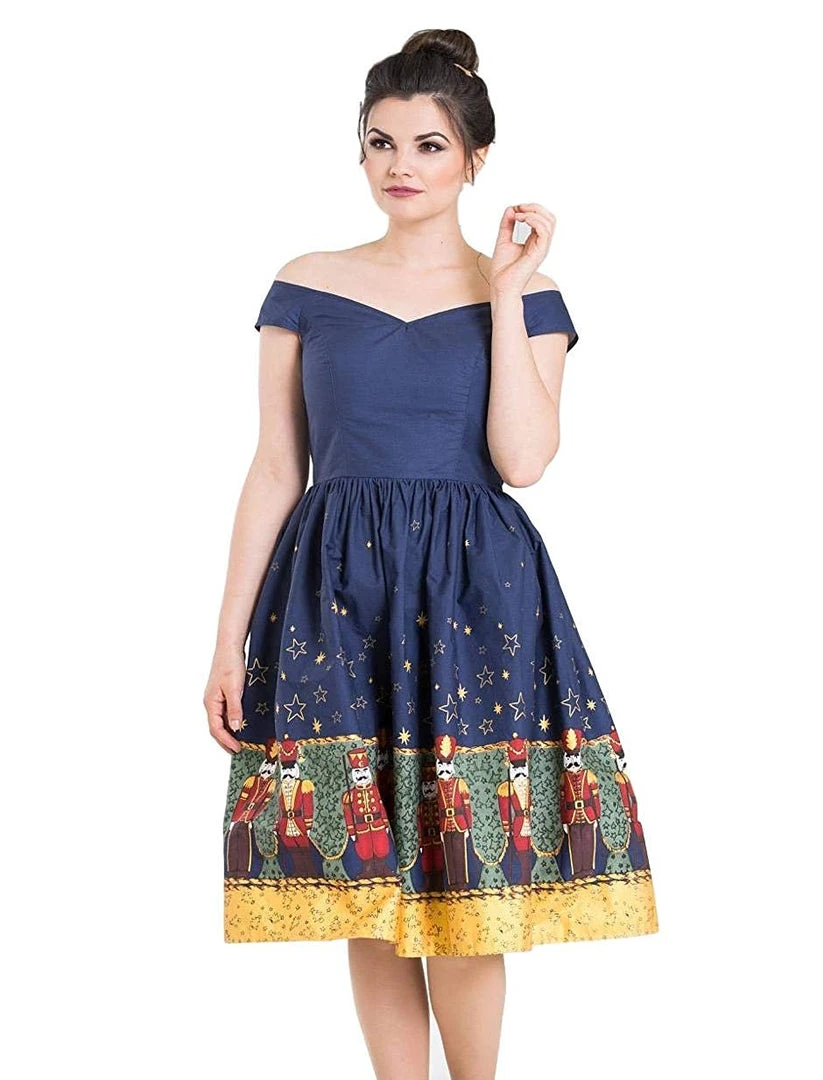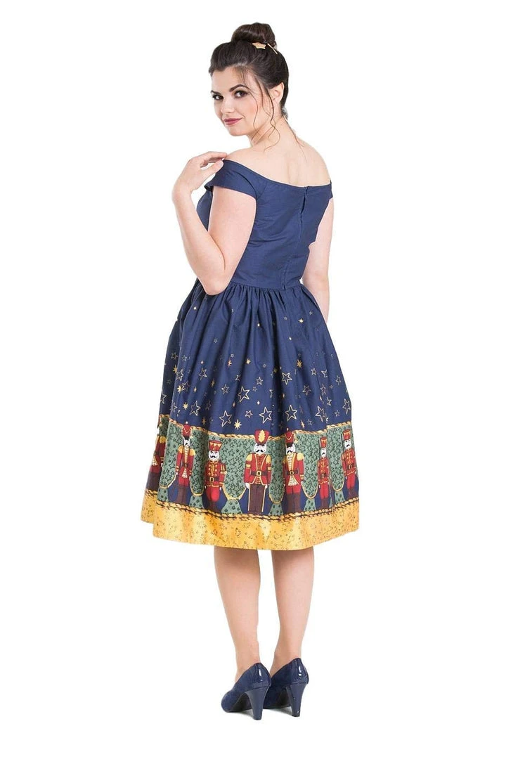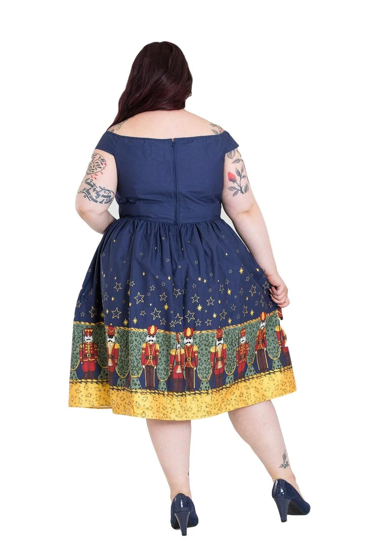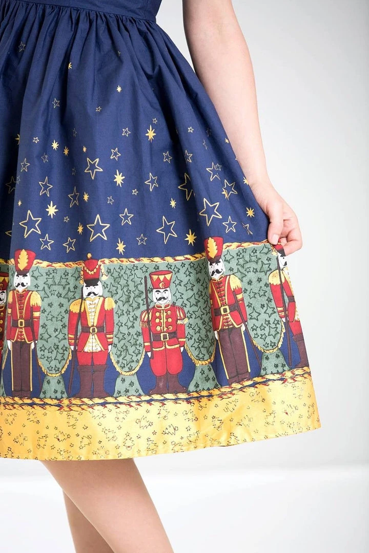 - Print is of nutcracker artwork and stars with gold detail on a navy background.