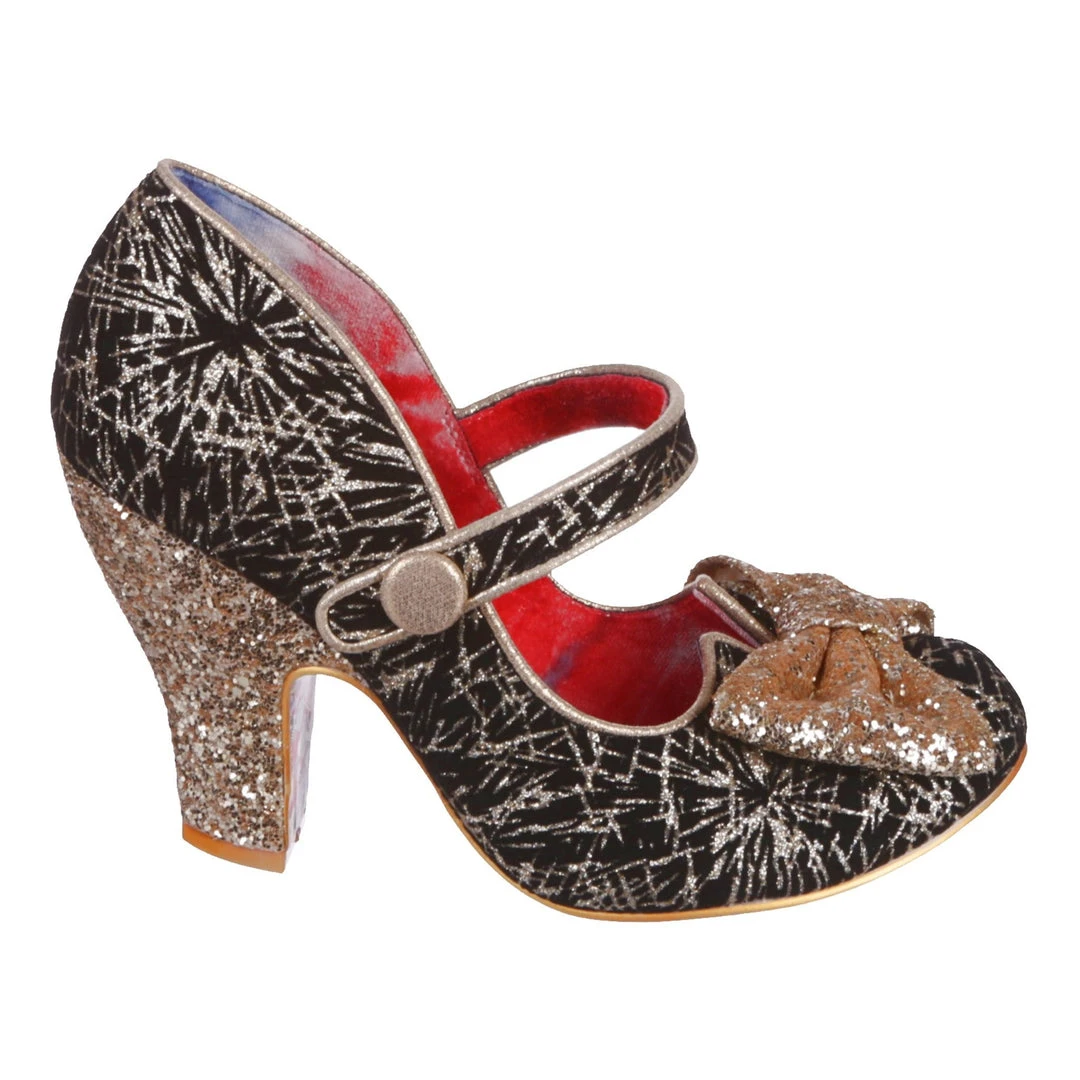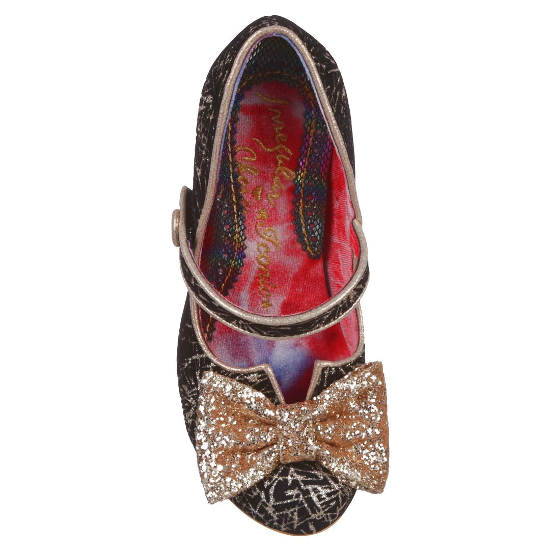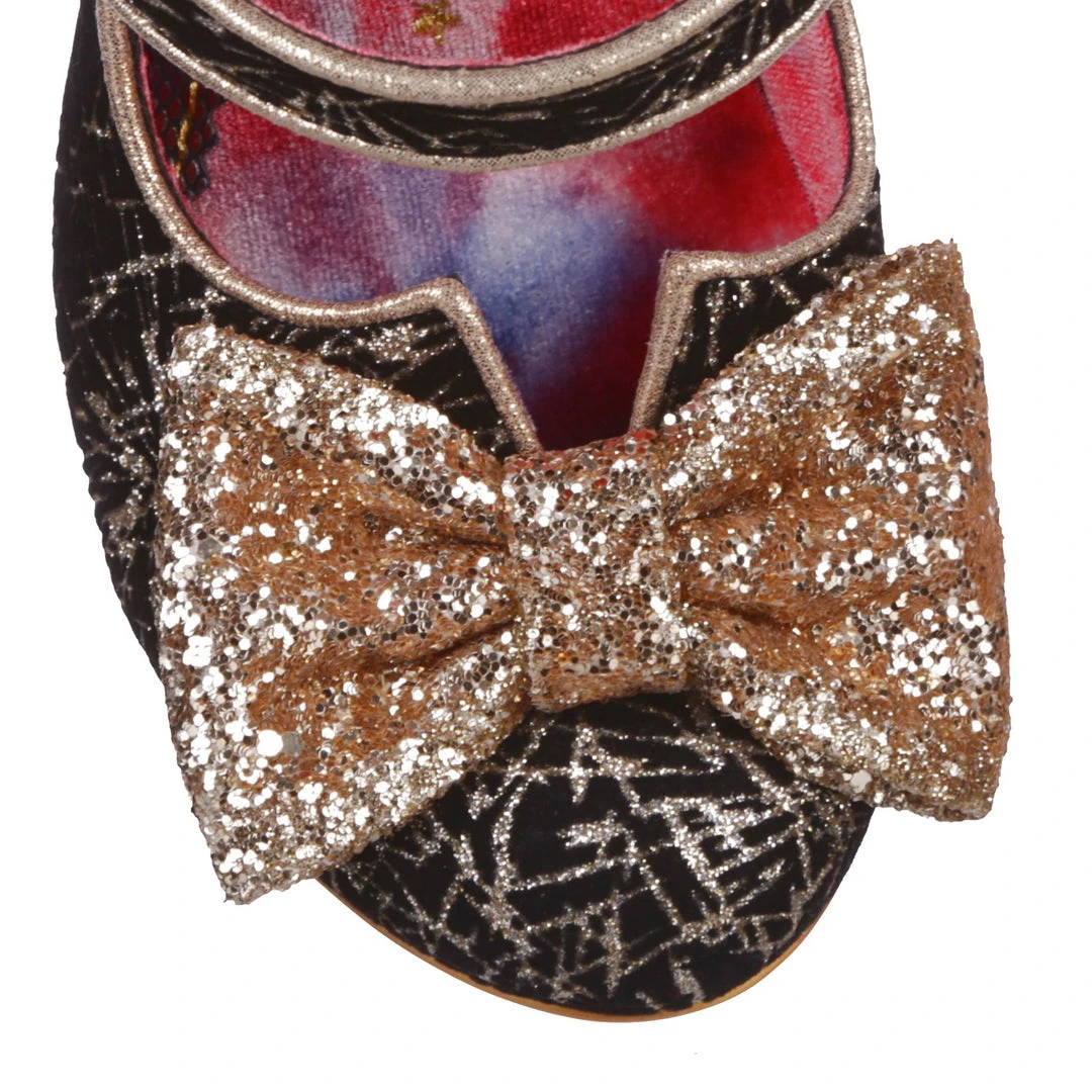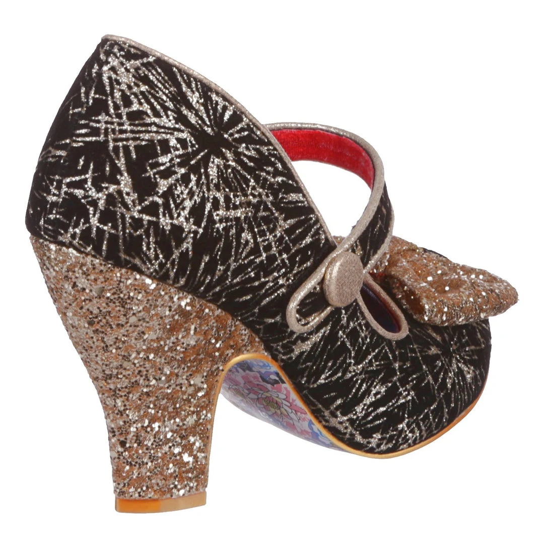 Want to add a drop of drama to your look? These high heels have a glittering personality and style by the bagful! A smashing golden metallic print is paired with a metallic glittering bow and heel, and wrapped up with a Mary Jane style strap for comfort and a splash of extra cute.Â