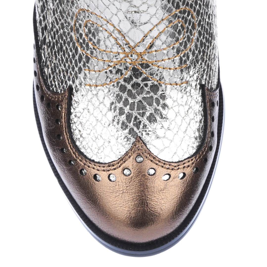 The classic silhouette is reimagined in iridescent bronze, smooth copper and bright silver, with stitched detailing really bringing the whole style together!