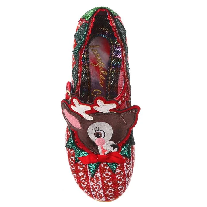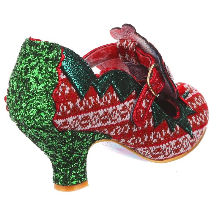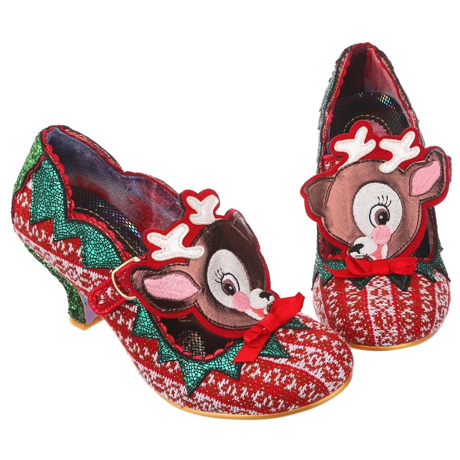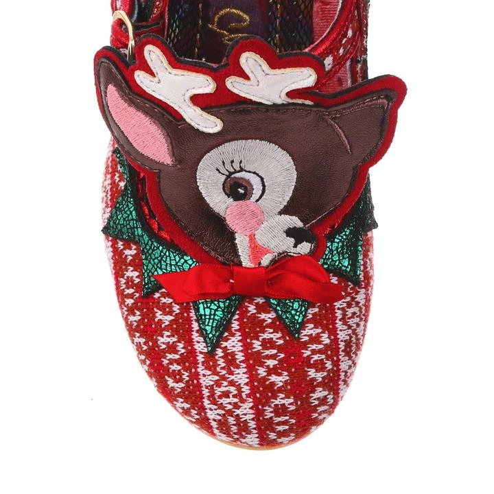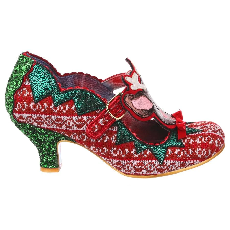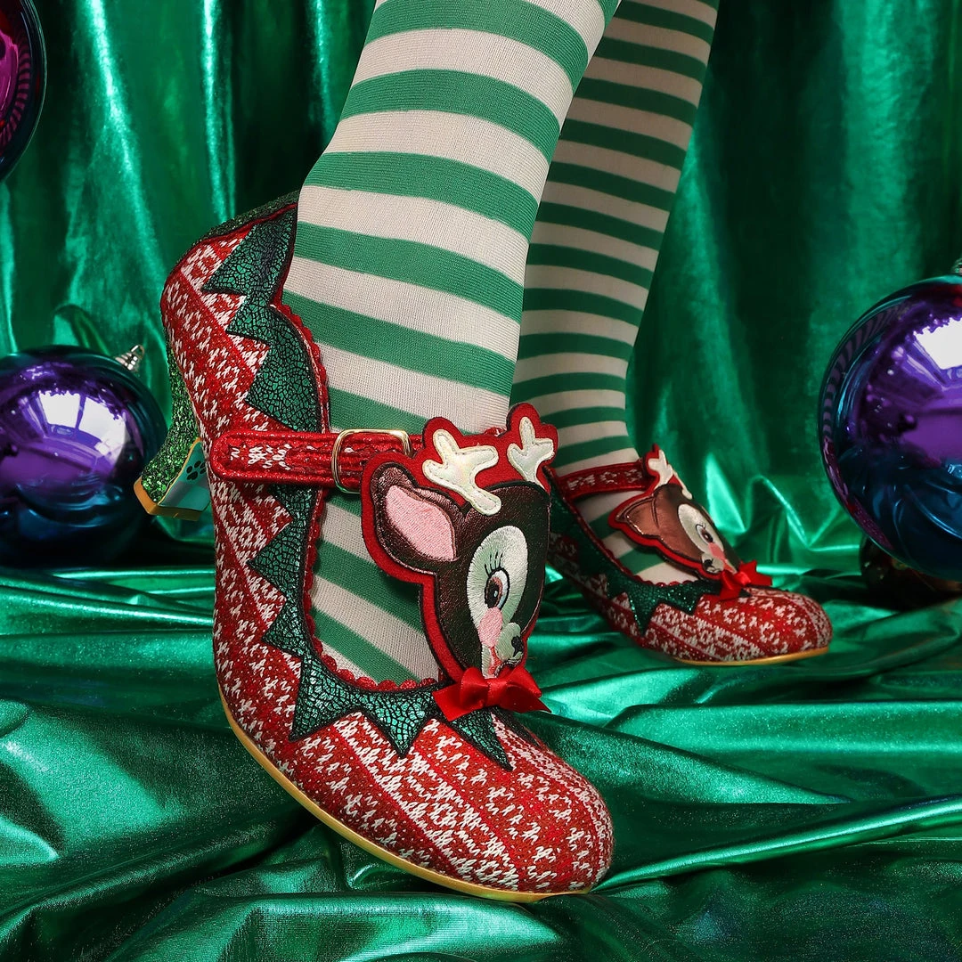 Time to play some Reindeer games? Be your best elf self in these festive fantasies! Adorned with the cutest little reindeer friend you ever did see, the Christmas jumper knit is topped with sweet red satin bow. With a comfy green glitter heel and T-bar buckle strap, these shoes will be top of your list this year!