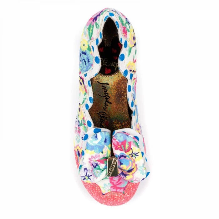 Skip with delight and embrace your inner Minnie Mouse in these super cute character heels. With a pastel floral and polka dot upper, scallop edges, a double padded bow and a glittering gold PU Minnie Mouse character heel.