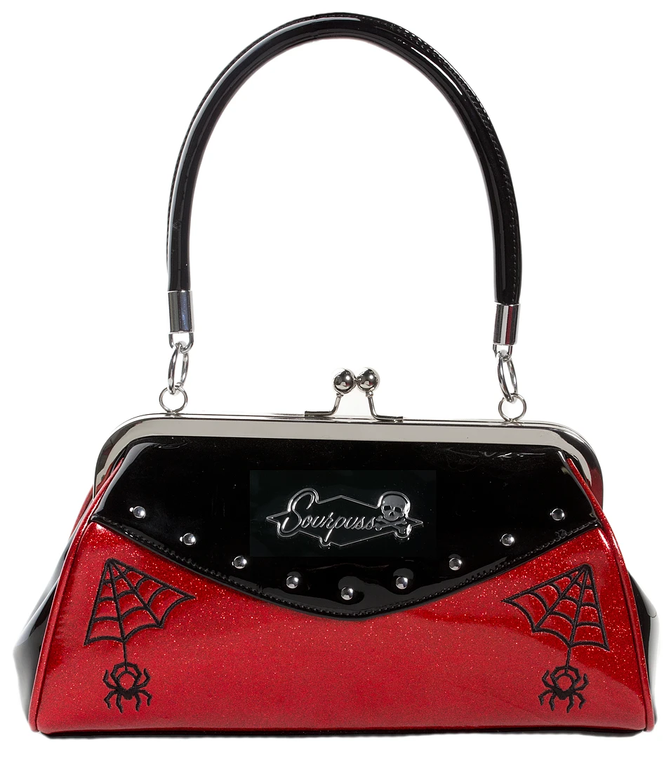 The Webbed Widow Purse has the most gorgeous, red glitter vinyl you ever did see! Complimented by spiderweb embroidery, it’s a must have handbag – day or night, Spring or Fall! A classic Sourpuss handbag, it features a sturdy, vintage shape, satin lining, kiss-lock closure and easy grip handles. Great for toting around at car shows or for a night out on the town!