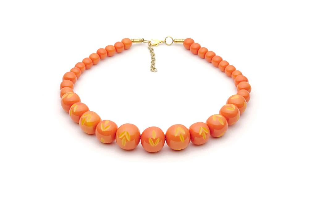 A little splash of springtime sunshine, the Freesia Carved Bead Necklace is a soft peach with delicate yellow carvings. This Duotone bead necklace is instant happiness in fakelite form. For a really retro 1950s look, team the Freesia Carved Bead Necklace with a sprig of Honeysuckle or two, or make it a fruity number with a pop of Raspberry.