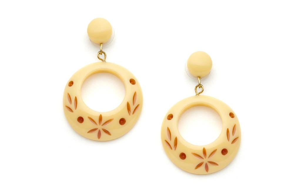 Rich and creamy, the Lait Carved Drop Hoop Earrings are 1940s Western inspired in style and, alongside Café, is the other half of the neutral Duotone partnership. Paired together they work in sync to give an iconic vintage look. We love popping some other brown fakelite in there too for a true Bakelite inspired vibe.
