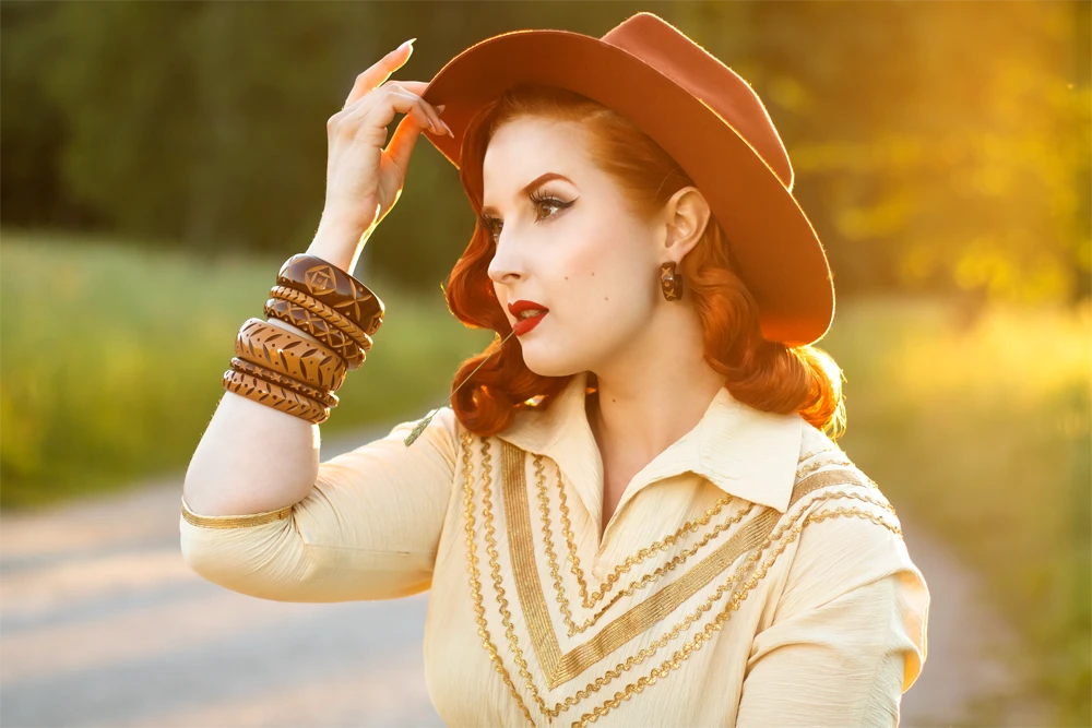 The perfect mixture of tropical vibes meets vintage western wear. Whether you’re a 1940s cowgirl on the ranch or a 1950s beach-side babe, Narrow Almond is the ideal addition to your fakelite bangle stack.