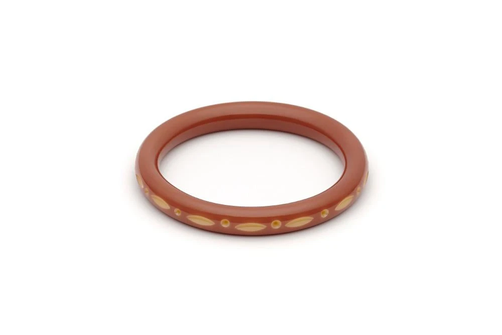 Deliciously vintage inspired, the Narrow Café Carved Bangle is a new edition to the Duotone collection to perk up your stack. Inspired by the popular Western styles of the 1940s, we love stacking Café with its (howdy) partner Lait, and a dash of Jade, for the perfect “riding off into the sunset” fakelite stack.
