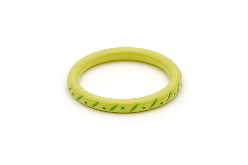 The Narrow Zest Carved Bangle is a vibrant green, designed to brighten up any fakelite stack. Inspired by the bright colours of the 1950s, this vintage style bangle mixes perfectly with Duotone buddy, Lime, and why not add in a splash of orange fakelite for a really tropical cocktail?