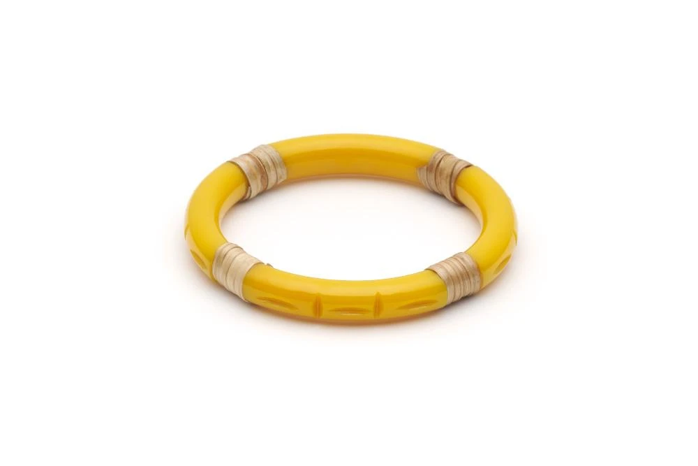 Ochre is a warm, earthy and rich yellow inspired by the tropical colours we see in vintage clothing, jewellery and homeware from the 1940s and 1950s. The fakelite Narrow Ochre Cane Bangle is available in three cane colour variants….decisions, decisions!