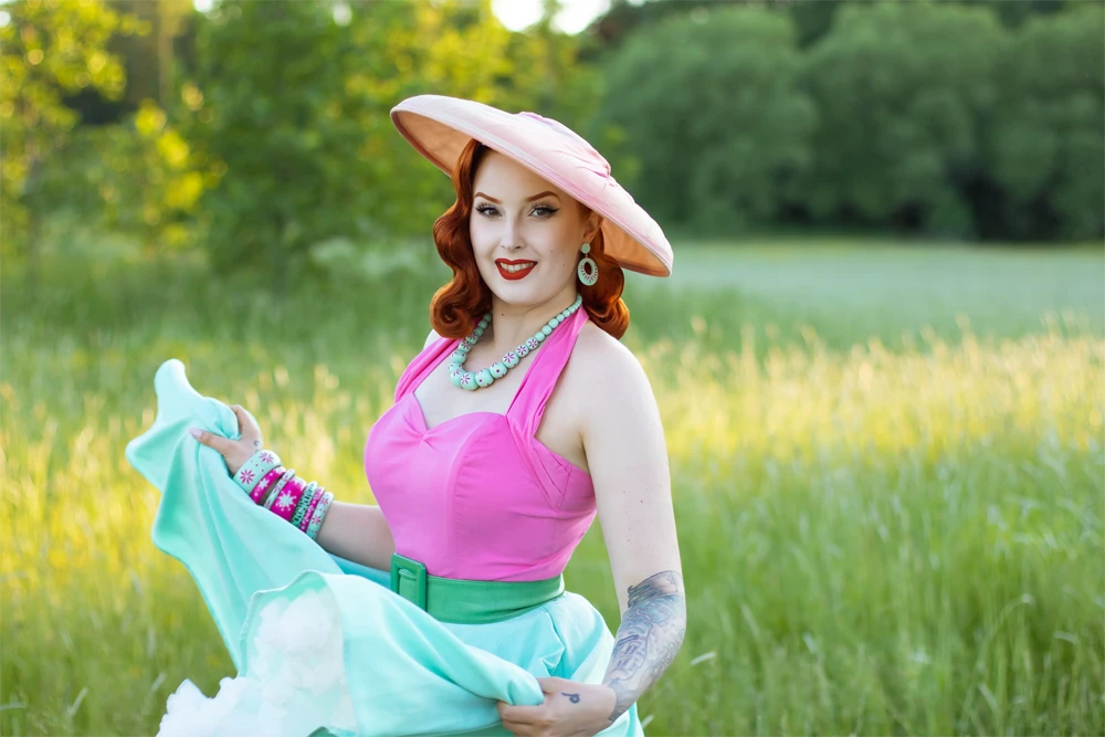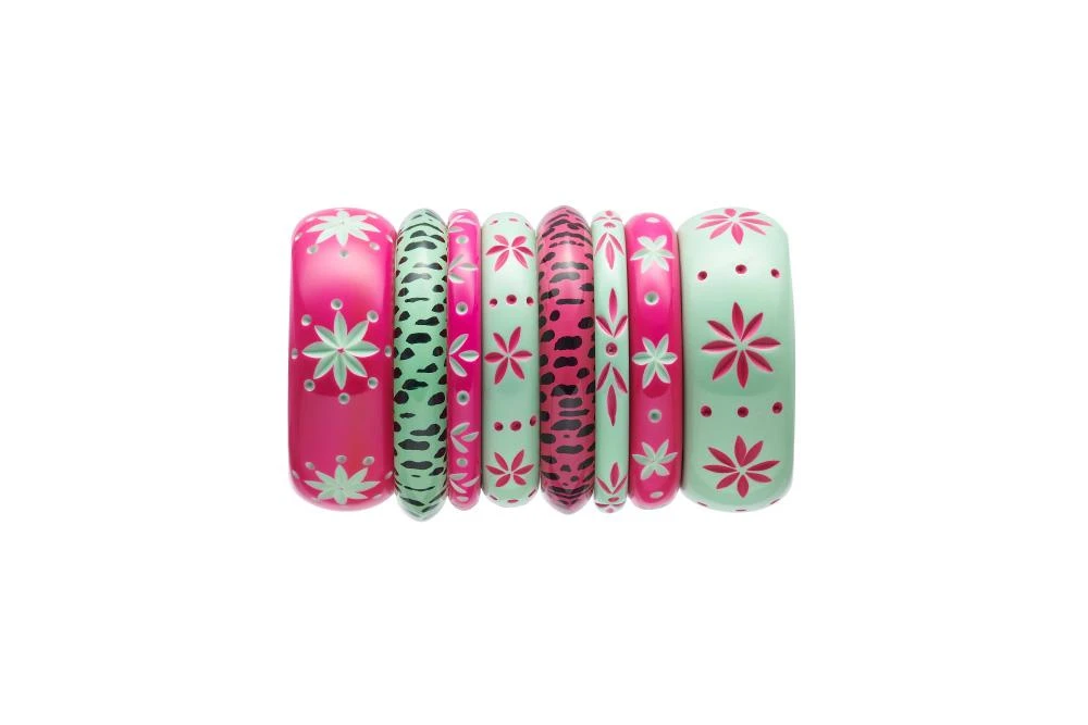 The perfect Duotone partnership of cool mint green fakelite with bright pink carving makes Parrot a great 1950s style summer combo. Ideal for all you who love a tropical getaway vibe to go with your vintage inspired outfit.