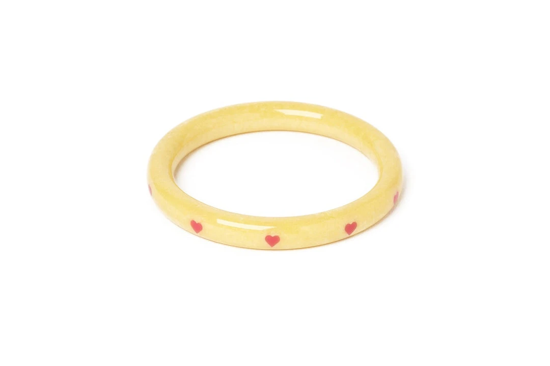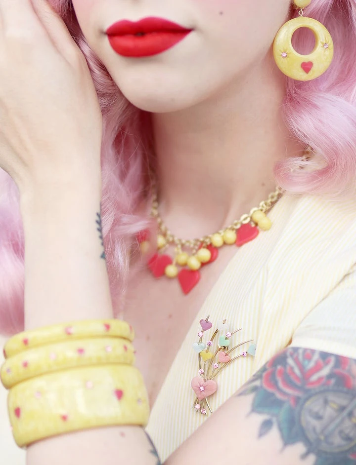 We are buzzin’ about this colour! A gloriously sunshiney yellow, the Narrow Honey Bunch Heart Bangle has 1950s style carvings and pink hearts for a kitsch kick.
