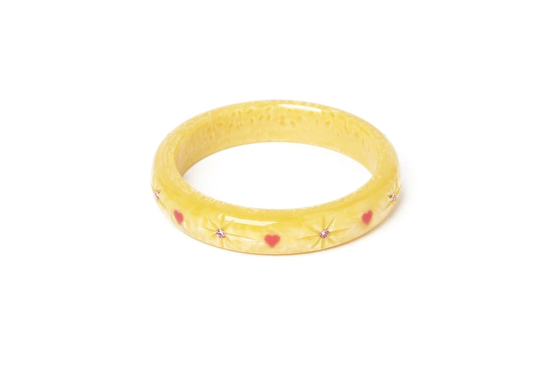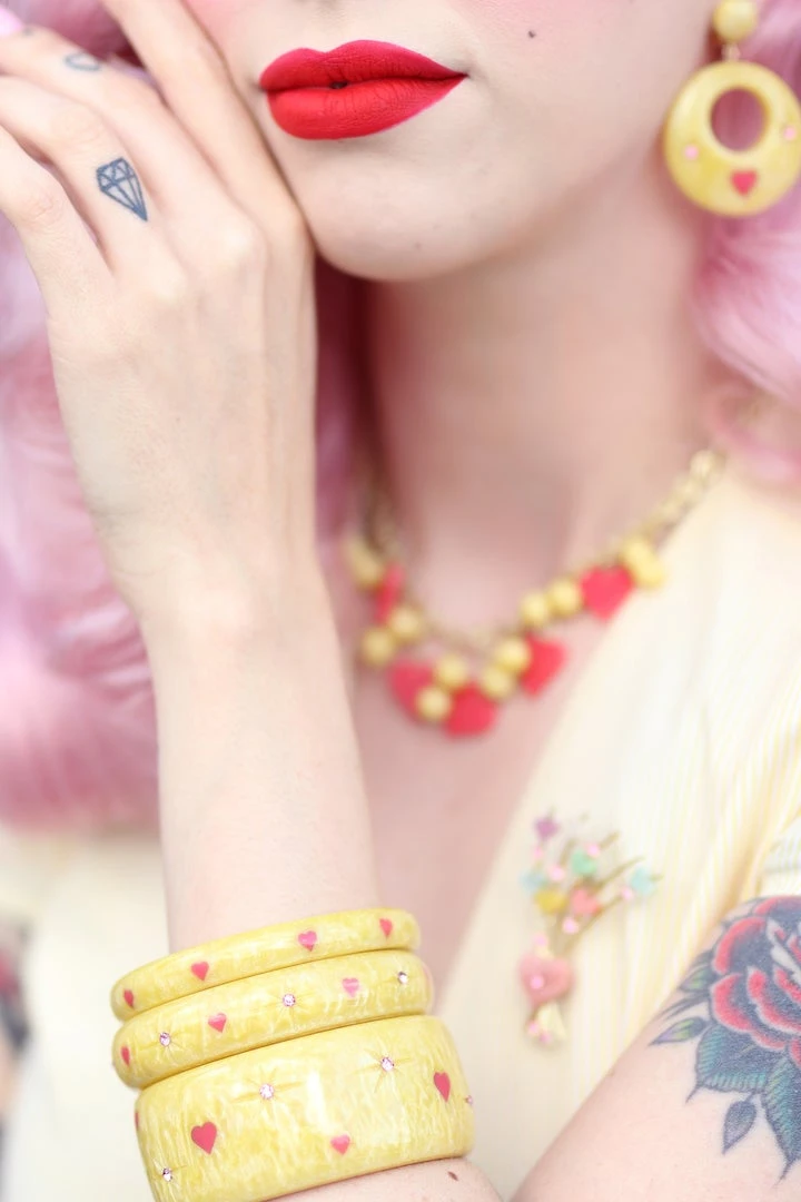 We are buzzin’ about this colour! A gloriously sunshiney yellow, the Midi Honey Bunch Starburst Bangle has 1950s style carvings and pink hearts for a kitsch kick.
