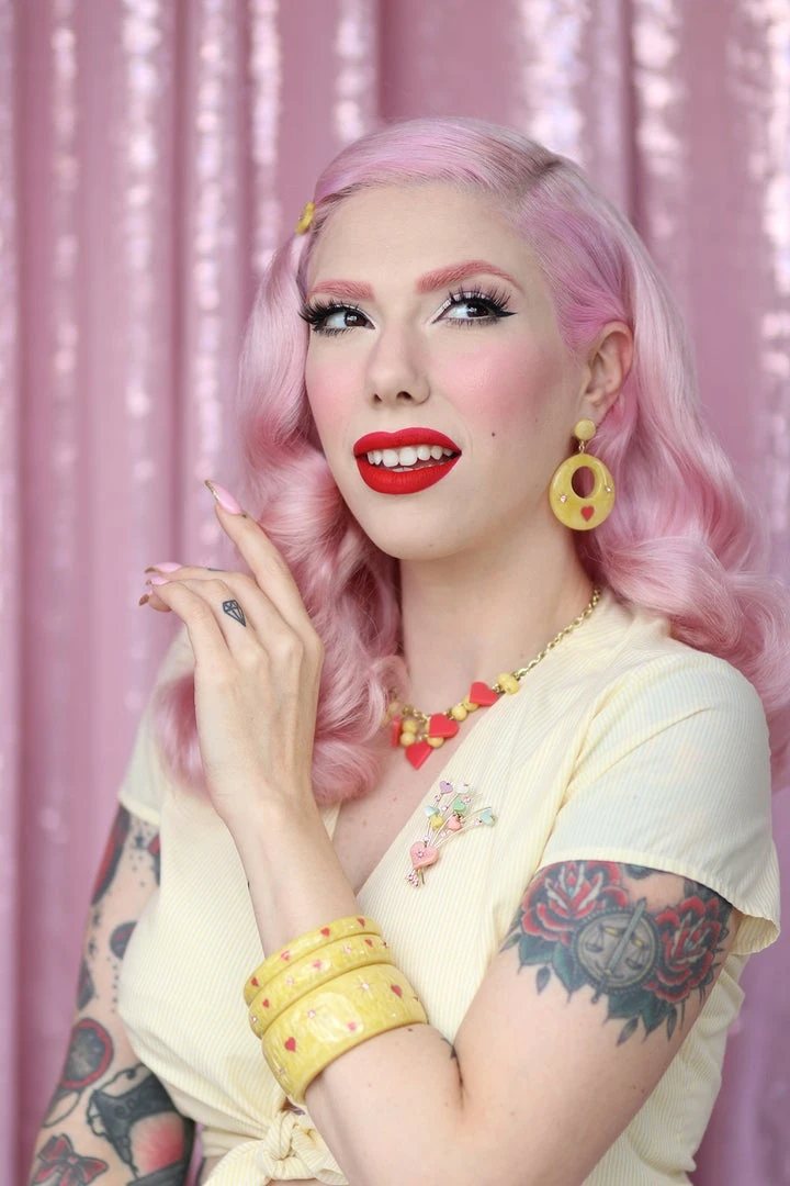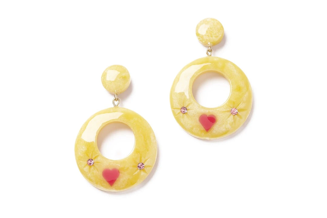 We are buzzin’ about this colour! A gloriously sunshiney yellow, the Honey Bunch Starburst Earrings have 1950s style carvings and pink hearts for a kitsch kick.
