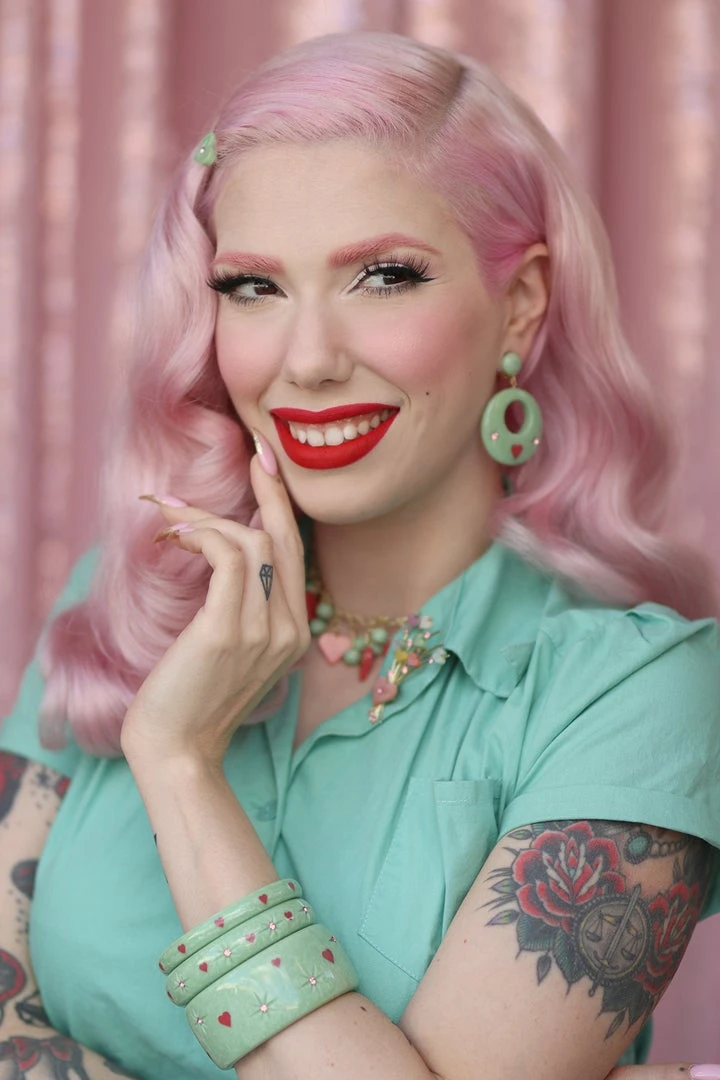 What a sweet colour combo! The Extra Wide Sweet Pea Starburst Bangle is a pastel green with cute pink hearts to add some contrast. The colour combo is super influenced by the 1950s but we love it for every and any decade!