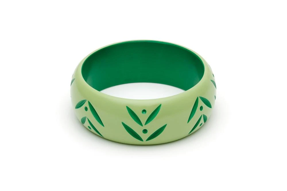 Feel fresh and fancy with our Wide Spring Carved Bangle adorning your wrist. A luscious light green with vivid green carvings create a dreamy Duotone combination perfect for any and all vintage lovers.