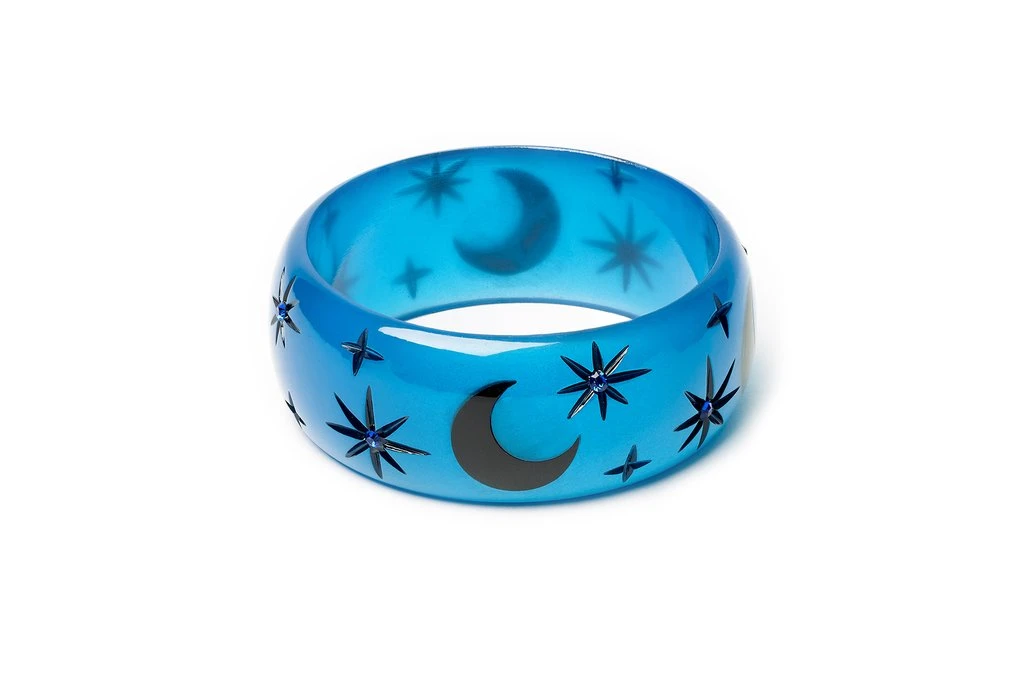 The Wide Wolf Moon Bangle is a supernatural blue with black moon and starburst details to give this bangle a retro Halloween twist. And it gets better! This entire Halloween collection glows in the dark! Charge up the jewellery and glow get ’em, ghouls!