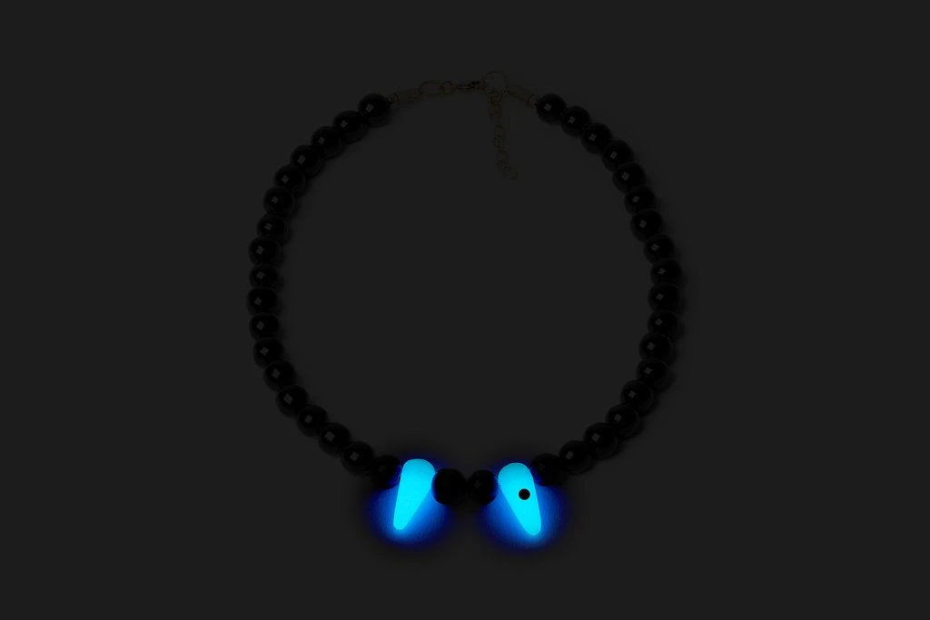 The Wolf Moon Fangs Necklace has black beads with supernatural blue fangs to give this necklace a retro Halloween twist. And it gets better! This entire Halloween collection glows in the dark! Charge up the jewellery and glow get ’em, ghouls!