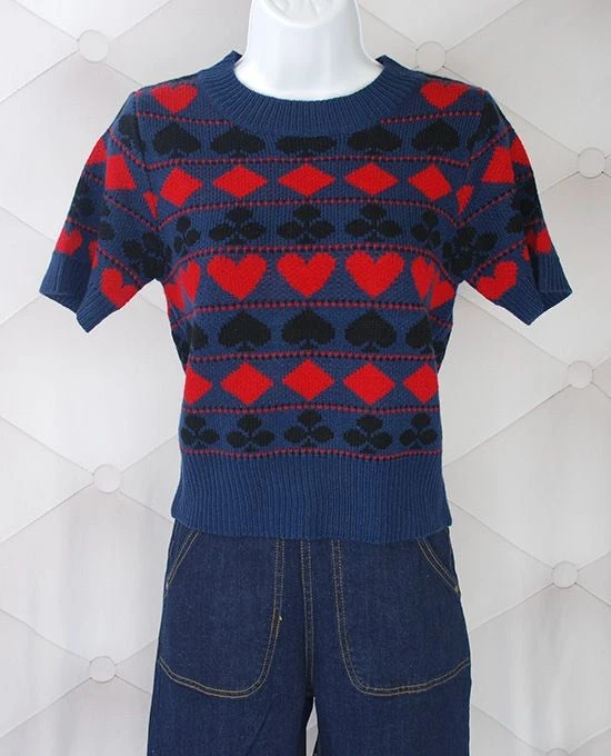 The Star Struck Clothing Playing Cards Reproduction Short Sleeved Sweater is an authentic reproduction of a 1940s short sleeve sweater featuring a cute playing cards pattern on the front and back.