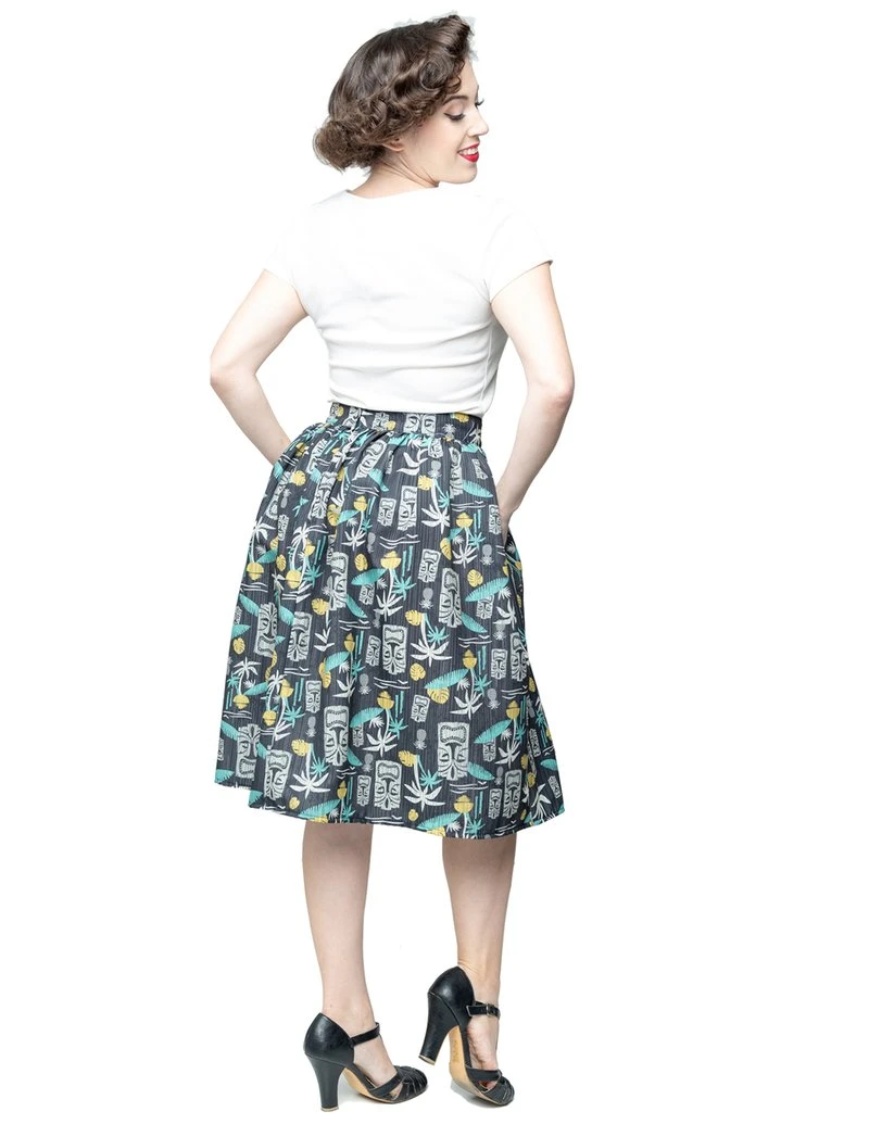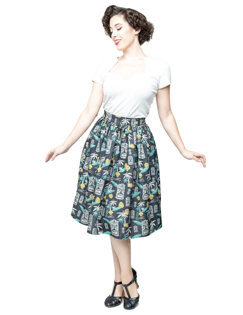 All those tropical vibes! Palm trees and Tiki masks cover this classic gathered knee-length skirt. A subtle wood grain in the print adds texture and depth, while the mint and yellow pops of color add a tropical flair. Featuring deep pockets and a back zipper closure.