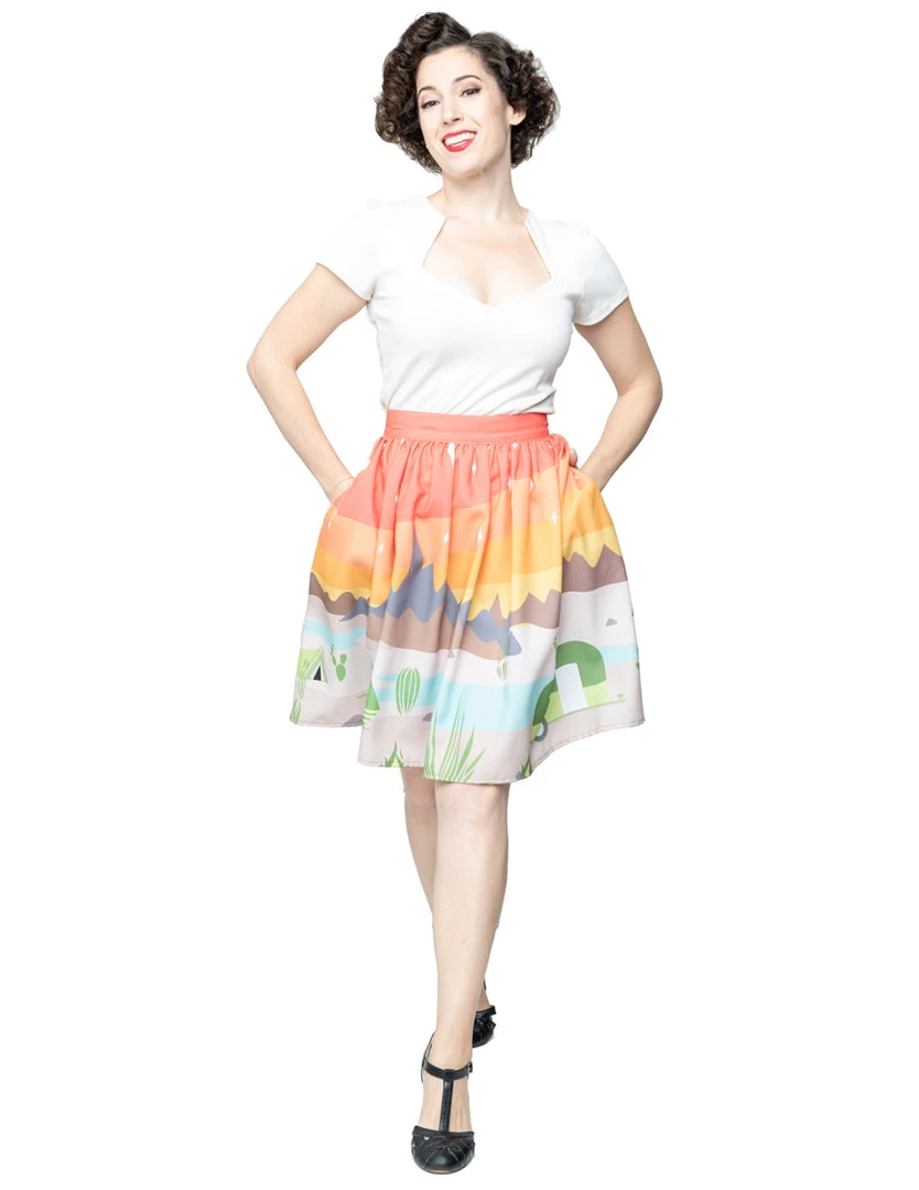 Get ready to hit the road and blaze new trails in this vintage camper and desert scene print skirt! Â