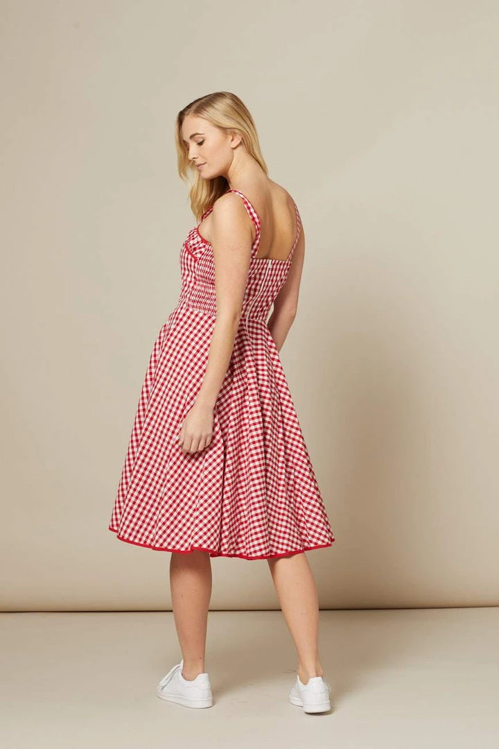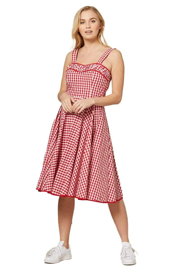 The Angie Gingham Dress is perfect for any occasion. The all over red and white gingham print makes her the perfect picnic dress! The fitted bodice is supported by thick straps, with a low sweetheart neckline which is beautifully embellished with red lace. The full swing skirt falls just below the knee, and the handy pockets add to the casual flare!Â