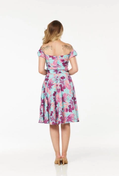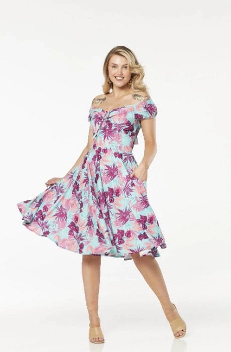 The Misty Fifties Swing Dress is a must have for every vintage inspired wardrobe! The off shoulder puff sleeves are gently ruched and an adjustable bow is centred. Created for twirling around in, the mid-length flared swing skirt is complimented by the fitted waist which will flatter all figures.