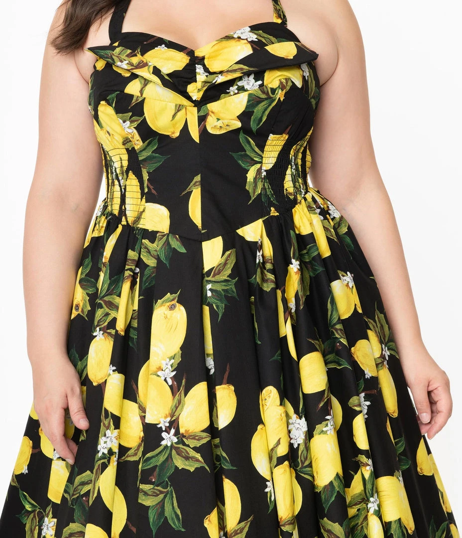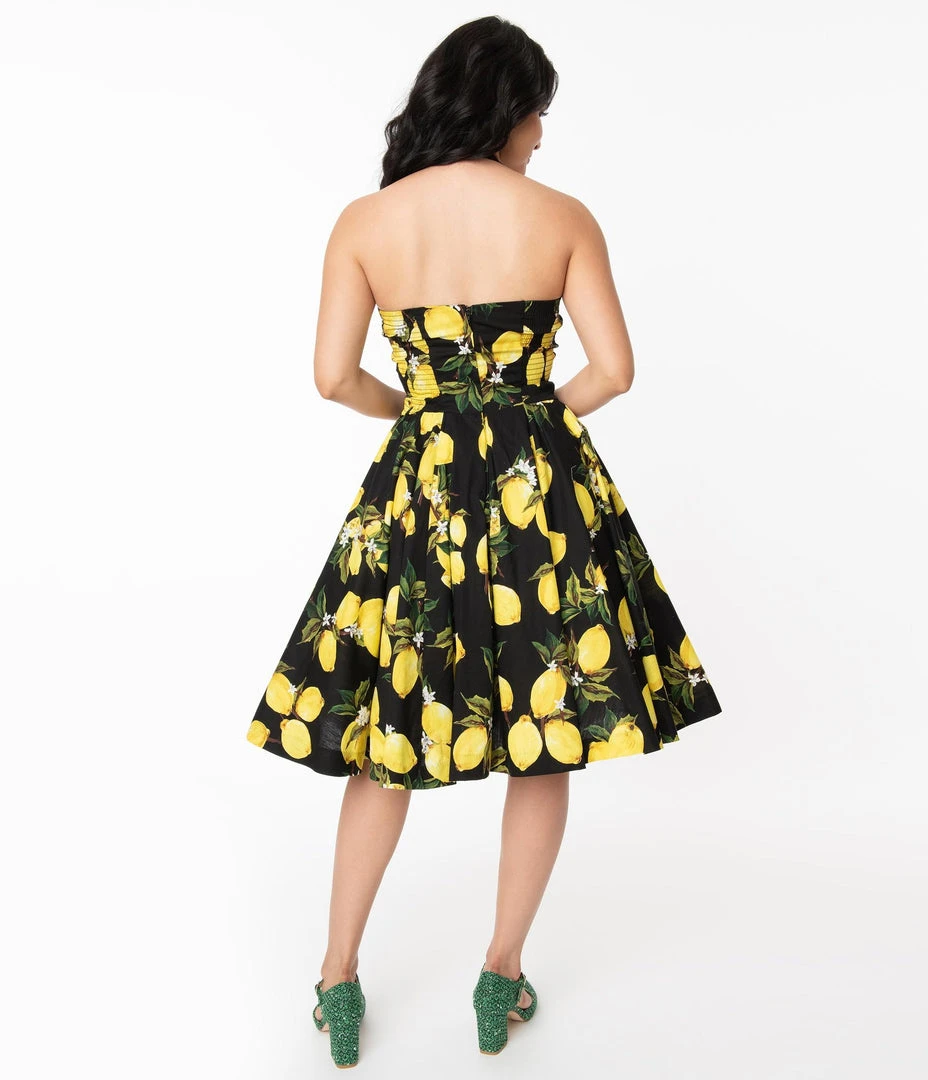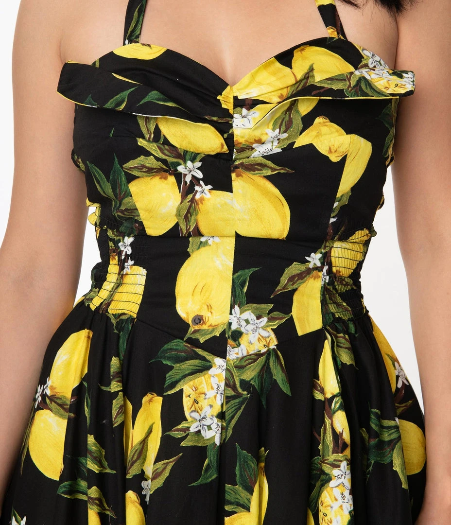 You’re the new vintage goddess, dames! A gorgeous swing dress from Unique Vintage, this midcentury style vision features a gorgeous yellow lemon print cascading through the black backdrop. The subtle sweetheart bust is embellished with adorable pleating and is subtly boned for added support while the smocked sides allow for a perfect fit. A sweet halter strap can be easily removed with darling buttons on the bodice. Seamed at the waist, the gathered swing skirt boasts an array of pleating for added flare as it cascades to a straight hem at the knees. Bring on the high tides and good vibes!