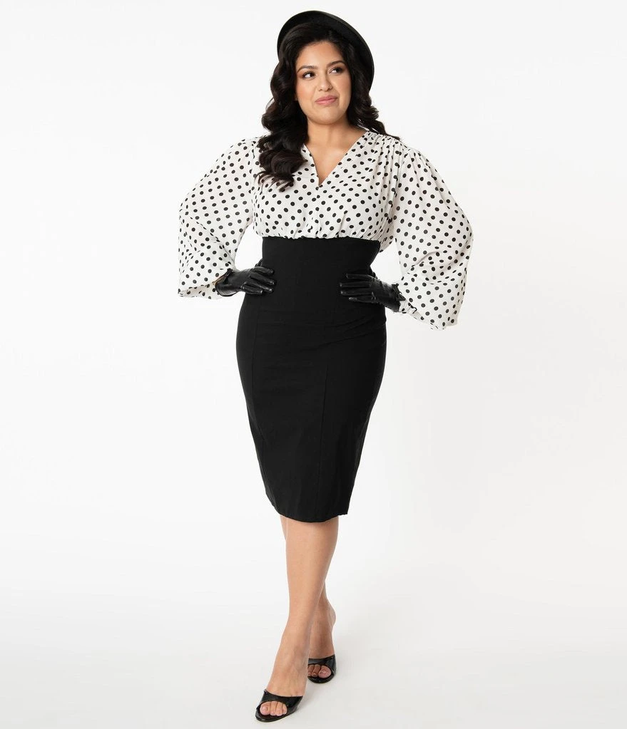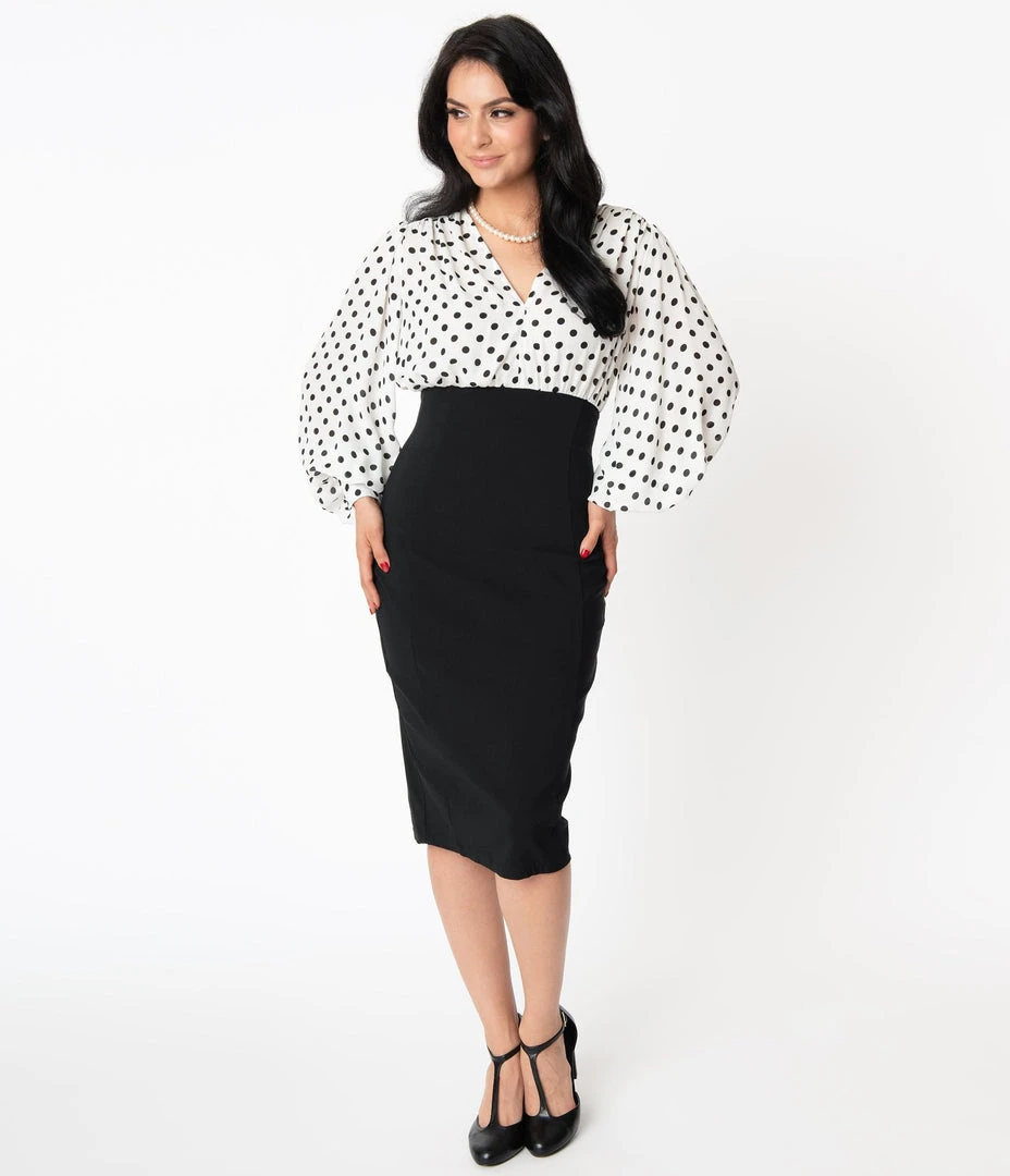 Life is better with a wiggle, darlings! A dramatic and show-stopping piece for modern dames, the Swanson Dress from Unique Vintage is an image of pin-up perfection. The semi-sheer blouse dances with black polka dots through the ivory backdrop while the plunging V-neckline is secured with a button back keyhole, framed by shoulder yokes and billowing long sleeves that drop into a button cuff. The high seamed waist tops a sultry black pencil skirt that hugs your hourglass for a flawless fit, outfitted with a back zipper and a pleated kick vent for fabulous frolics!